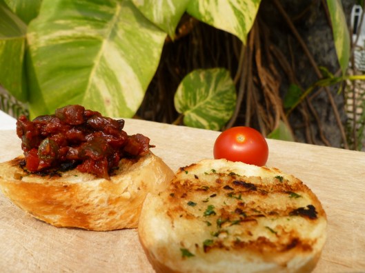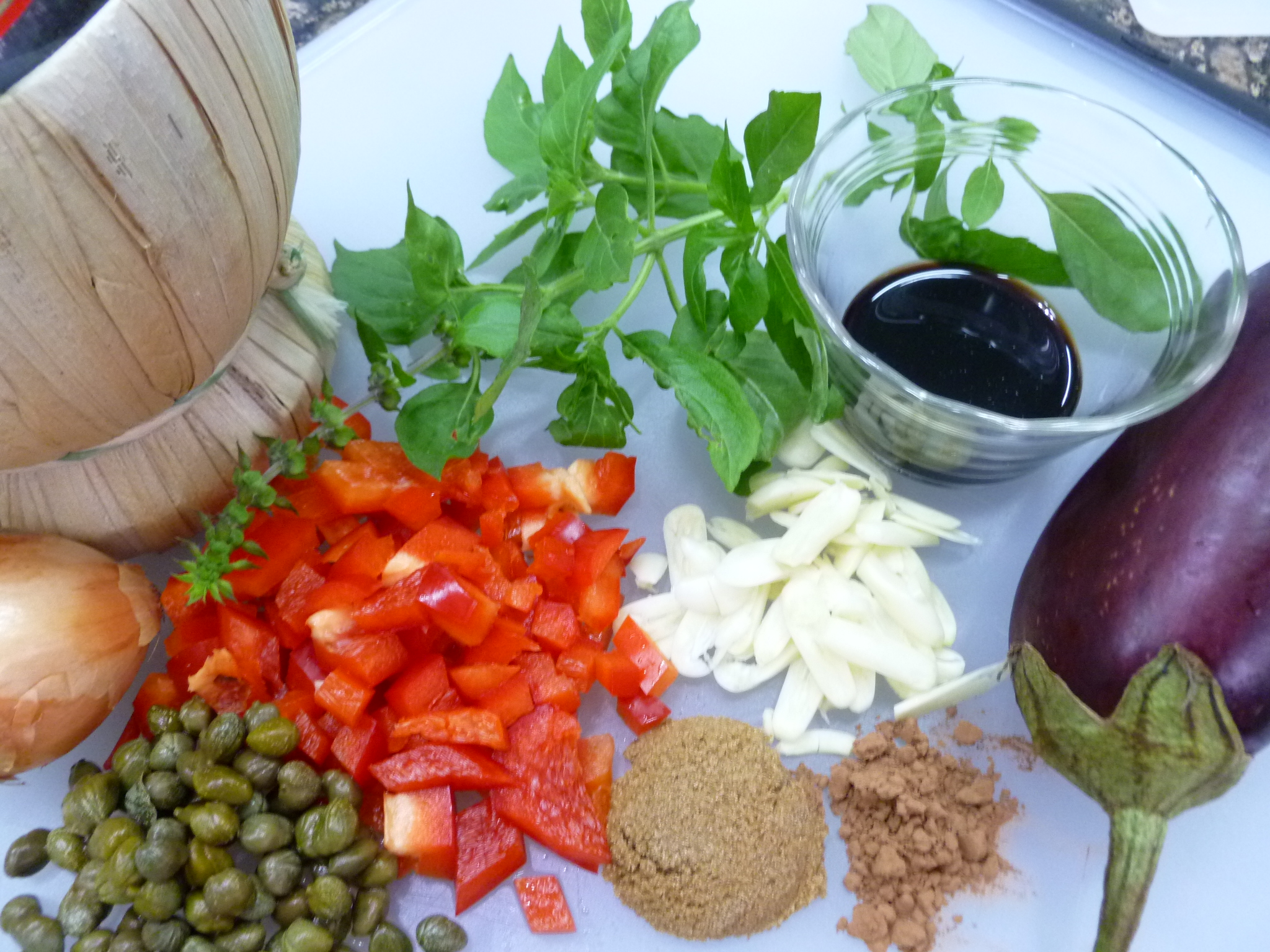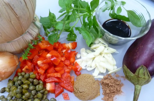 When you have done this, and stuck the results in the freezer– there it is as an option to bring out and serve with drinks. But, if you–your friends–your loved ones–ate it, and you are about to make a multi-course lunch or dinner, it is good to have options. Caponata on Grilled Garlic Butter Toasts is one of those options.