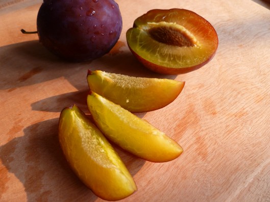 2.  Cut the plums in half, remove the pits and cut each half in slices: