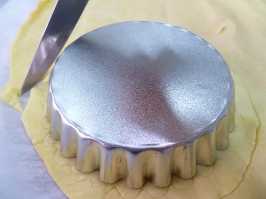 1. If you are using a large round of puff pastry, roll it out a little to increase the number of tart shells you can cut out of it before re-rolling it. Do the same if you are using rectangles.