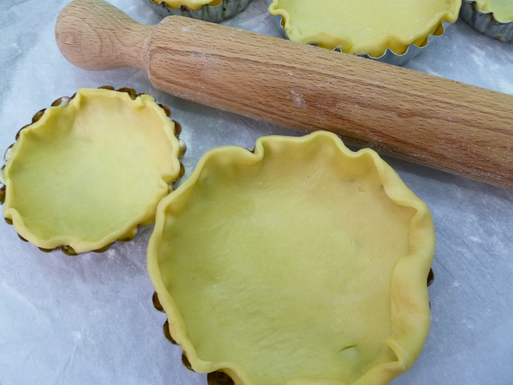 3. Fit the pastry rounds into the pans. The pastry doesn’t need to be pressed in tightly, but the tarts will unmould more easily if the pastry comes up a little higher than the rim of the pan since the filling is less likely to spill over between the pan and pastry: