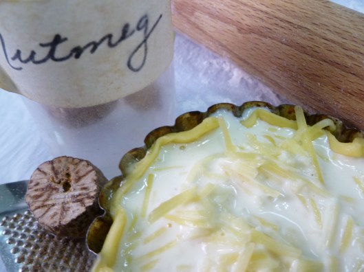 4. Whisk together the cream, milk, eggs, and flour. Add a little salt and a few grinds of pepper. Grate a little nutmeg intor it and pour the mixture over the cheese in the shells: