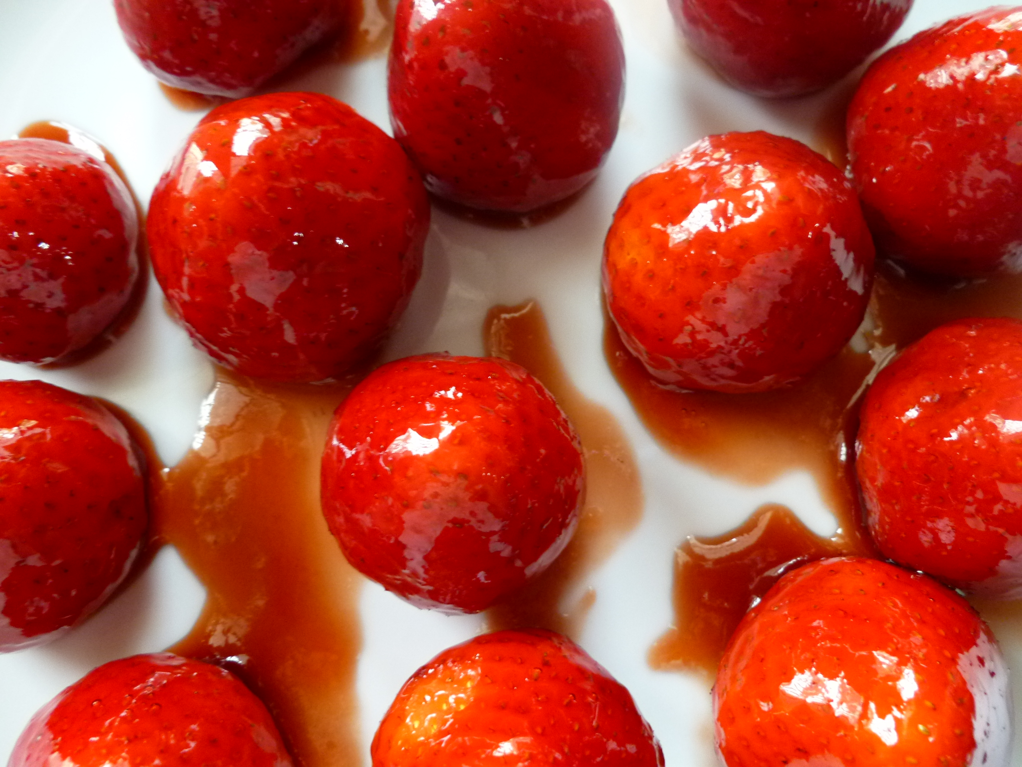 2. Heat the jelly just until it warms and becomes more fluid. Run it through a strainer into a bowl. Dip the berries into the jelly and place them on a plate, cut side down. Reserve the rest of the jelly at room temperature. Put the berries in the refrigerator until time to arrange the Dents de Lion on the plates. The strawberries form the lion’s “teeth”. They can be prepared early–in the morning of the day you are making the dessert: