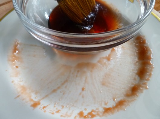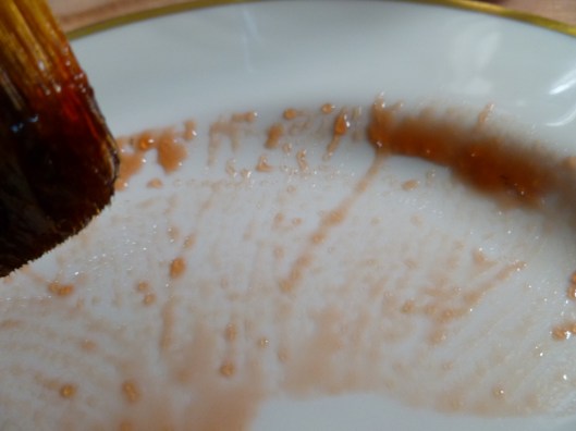 9. Just before serving, arrange the Dents de Lion on the dessert plates. First, with the pastry brush, make the lion’s ‘mane’ on each plate by brushing jelly in a semi-circle from the center towards the inner edge of the outside rim–all around half of the plate: