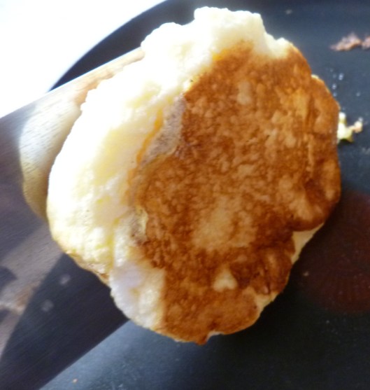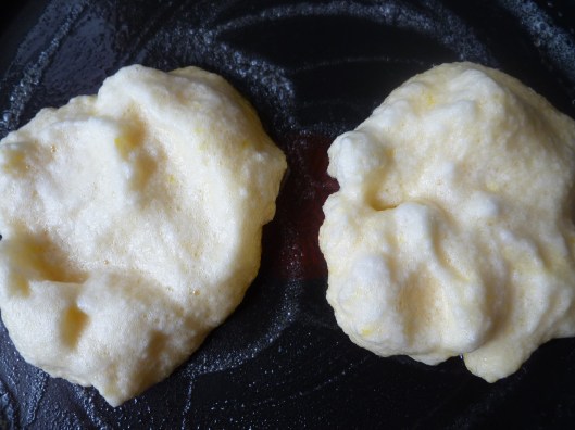 6. Heat a little butter in the pan and swirl it around the bottom. When the pan is hot, drop mounds of the egg mixture into it with a large spoon or ice cream scoop and lightly spread the mounds into circles of between 3 and 4 inches in diameter. Make 3 or 4 at a time: