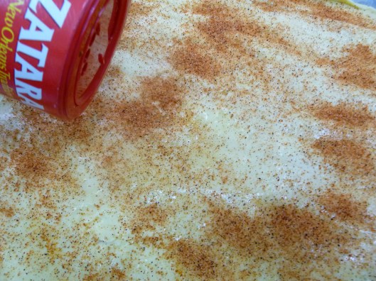 2. Brush the pastry with the egg. Sprinkle the spices or herbs on it with a liberal hand: