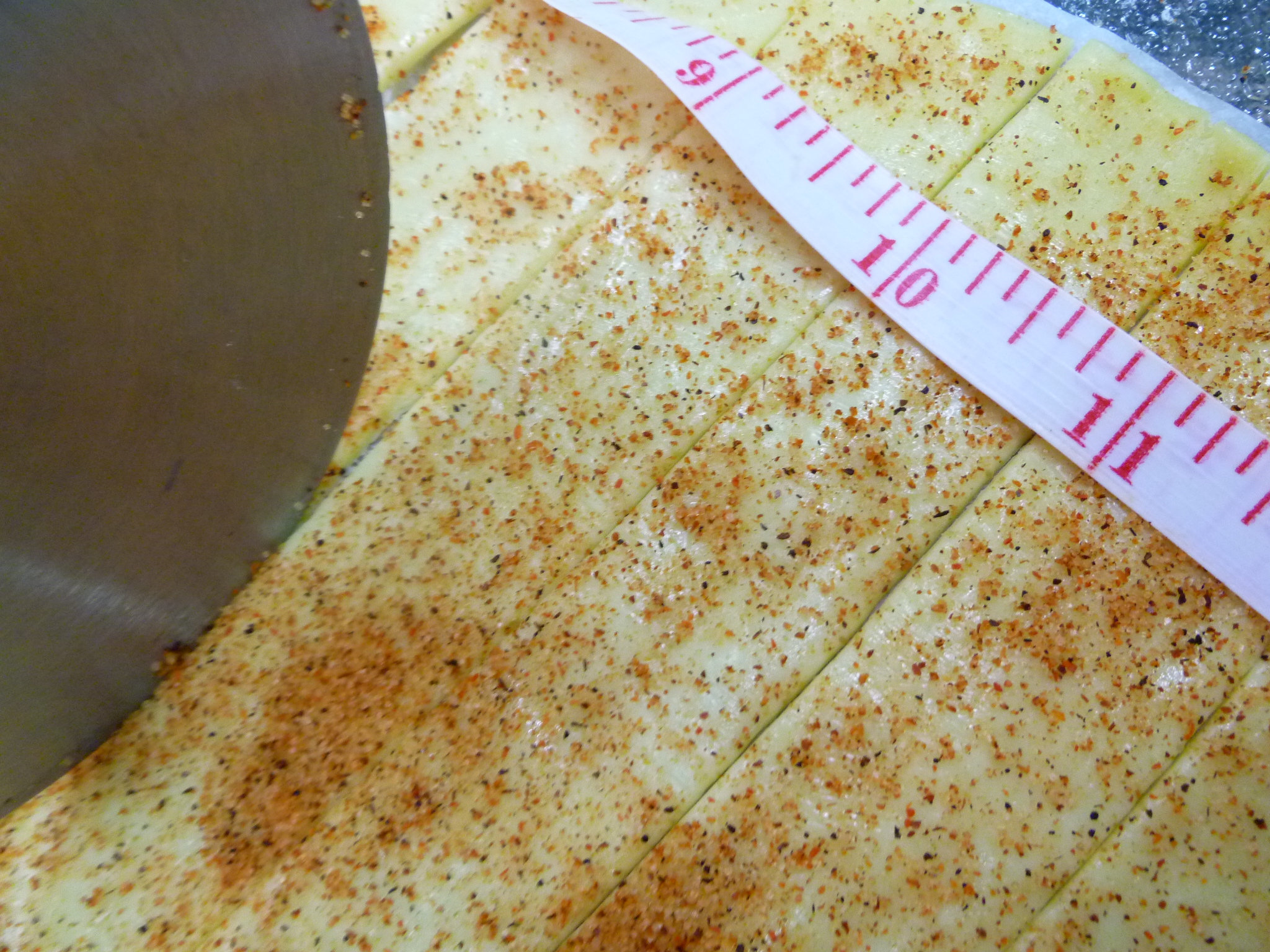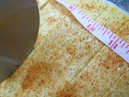 3. With the pizza cutter, slice the dough into 1-inch strips: