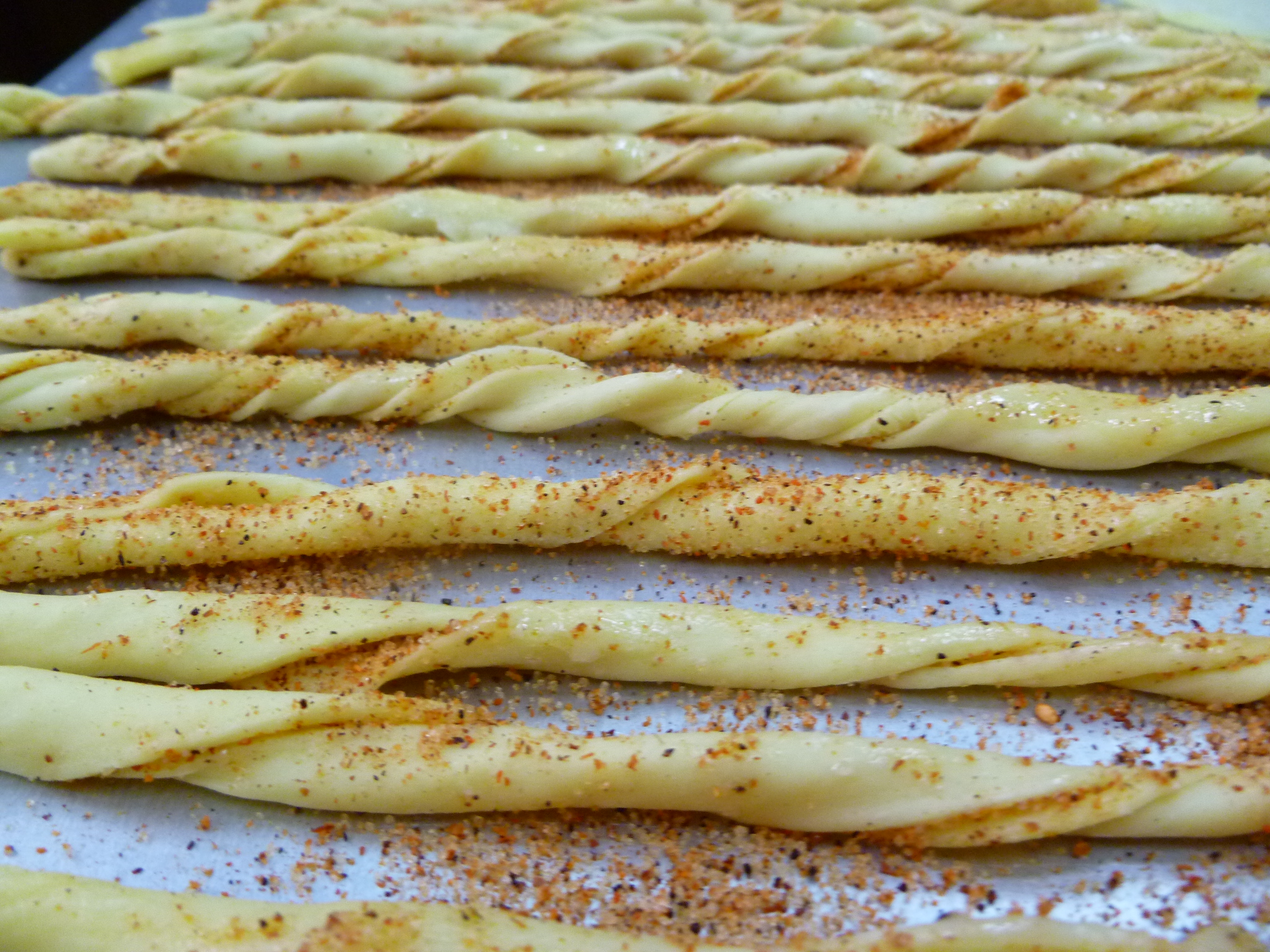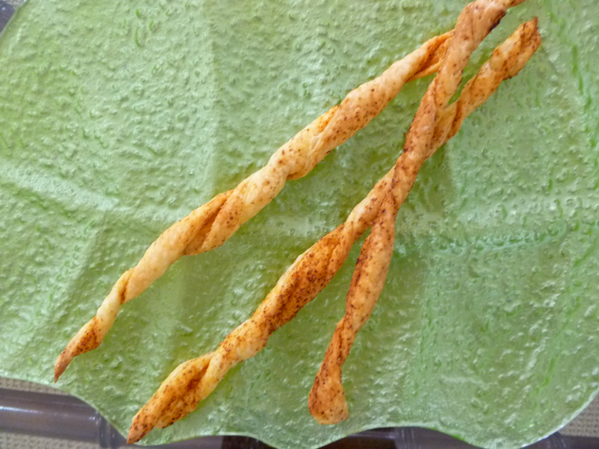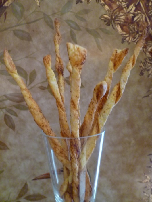 Usually Grissini are long, dry breadsticks. The idea of making them out of pastry instead, comes from Gusto, an Austrian cooking journal. The Gusto version lays thin slices of garlic on flat strips of pastry. The version in the photo spices the pastry and twists the strips. Your version might be some other combination of herbs or spices–shaped or maybe not. Whether you make Gusto‘s Grissini, the Creole-spiced ones shown here, or your own invention, they all set their improving mark on the original.