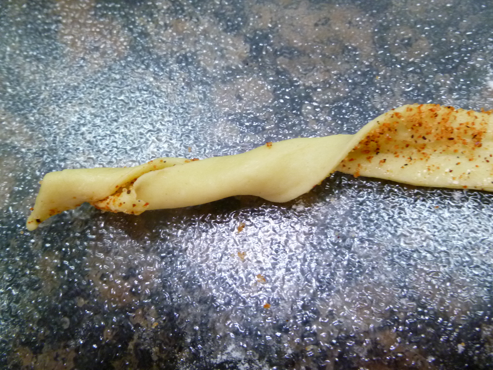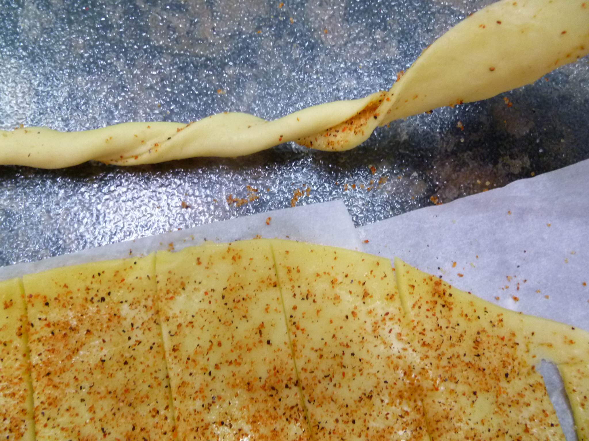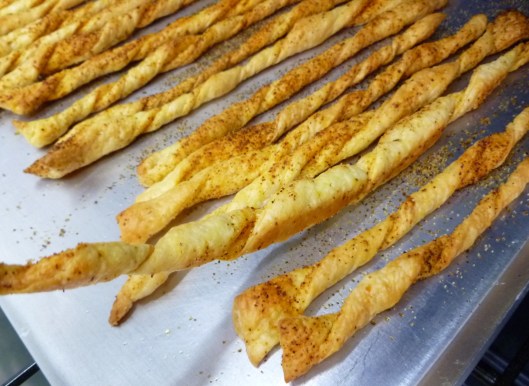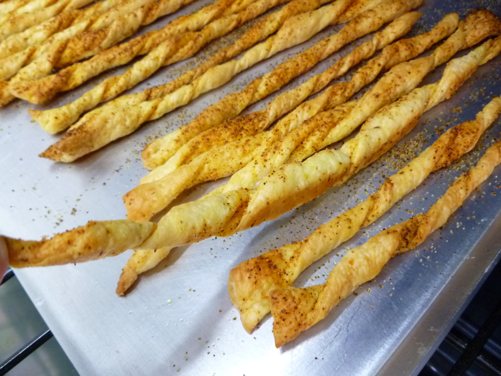 Usually Grissini are long, dry breadsticks. The idea of making them out of pastry instead, comes from Gusto, an Austrian cooking journal. The Gusto version lays thin slices of garlic on flat strips of pastry. The version in the photo spices the pastry and twists the strips. Your version might be some other combination of herbs or spices–shaped or maybe not. Whether you make Gusto‘s Grissini, the Creole-spiced ones shown here, or your own invention, they all set their improving mark on the original.