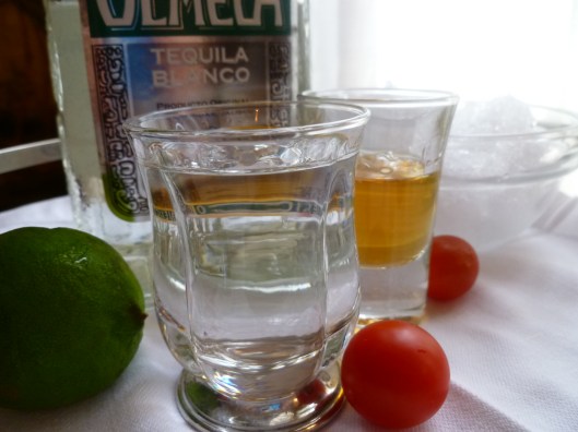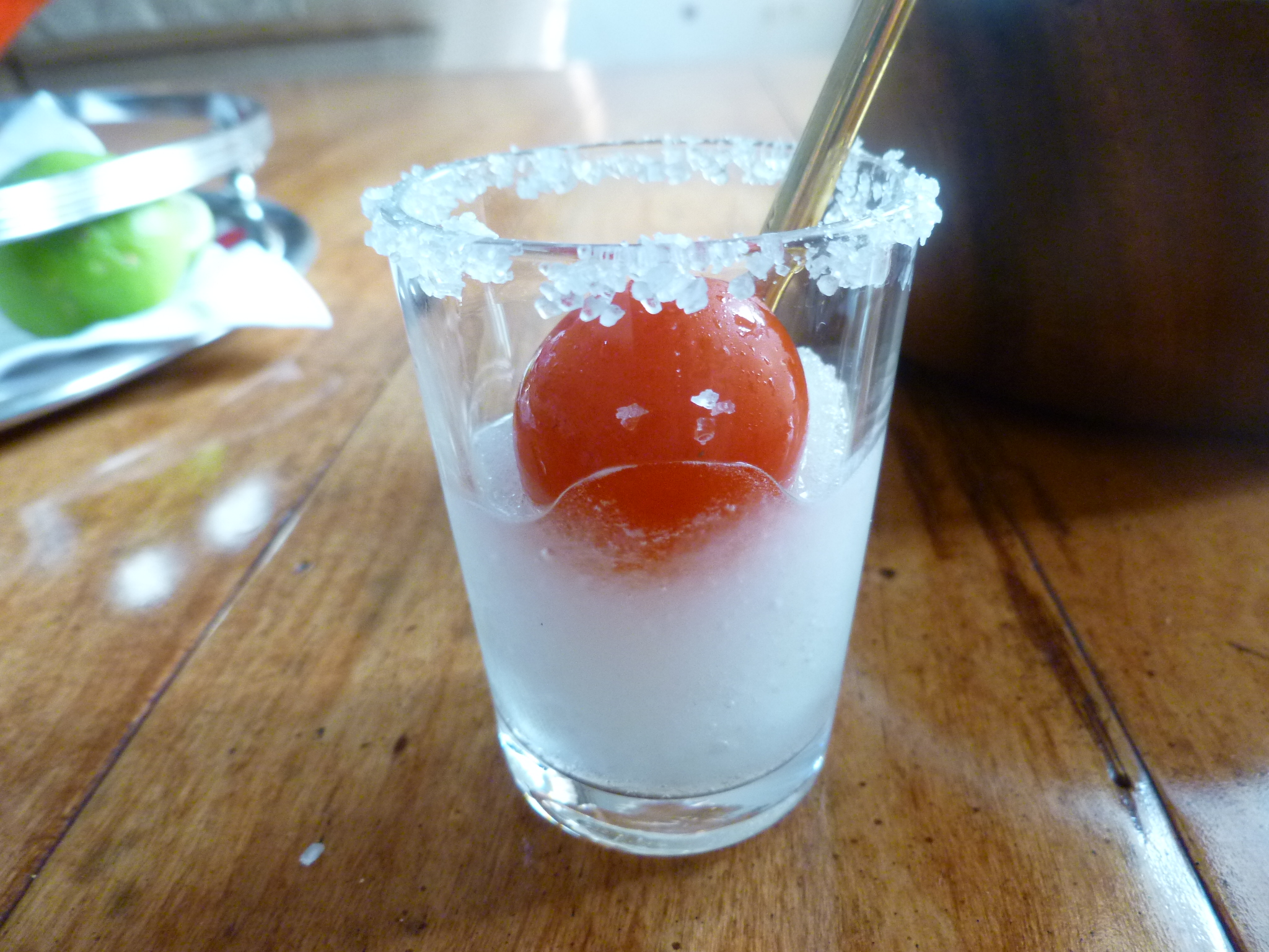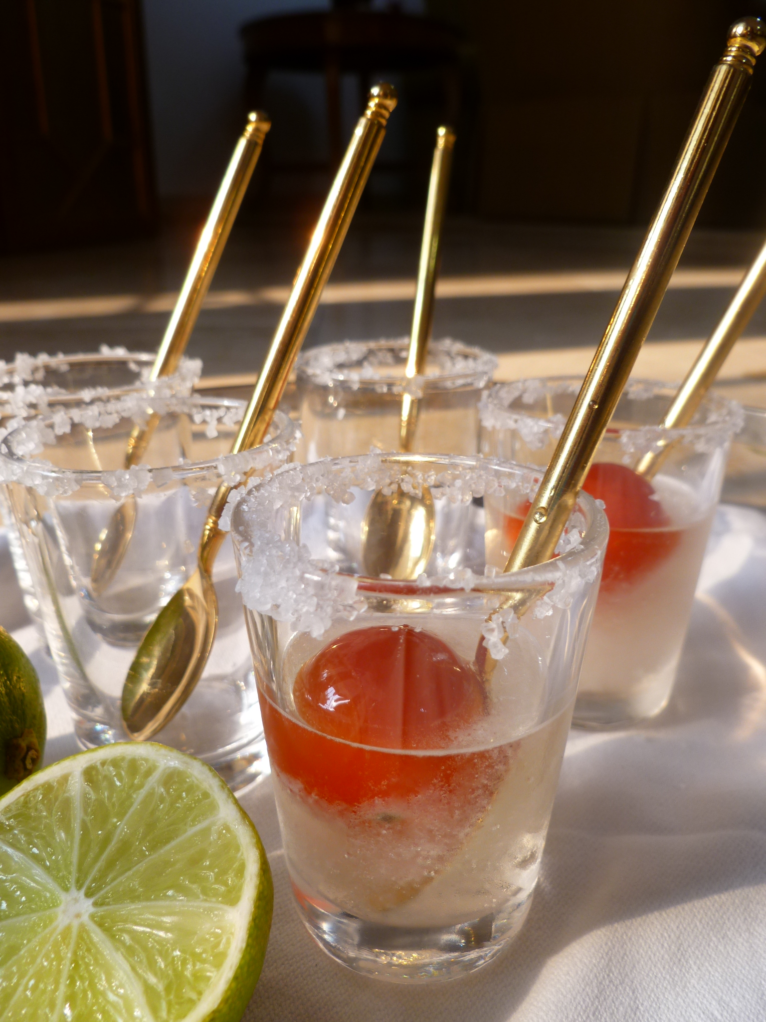 3. About 20 minutes before serving this hors d’oeuvre, put the cherry tomatoes into the Frozen Margarita slush. Leave it all in the freezer until you fill the shot glasses. The tomatoes will freeze. (If you like frozen grapes, there is a good chance you will like frozen tomatoes. Their textures are similar.)