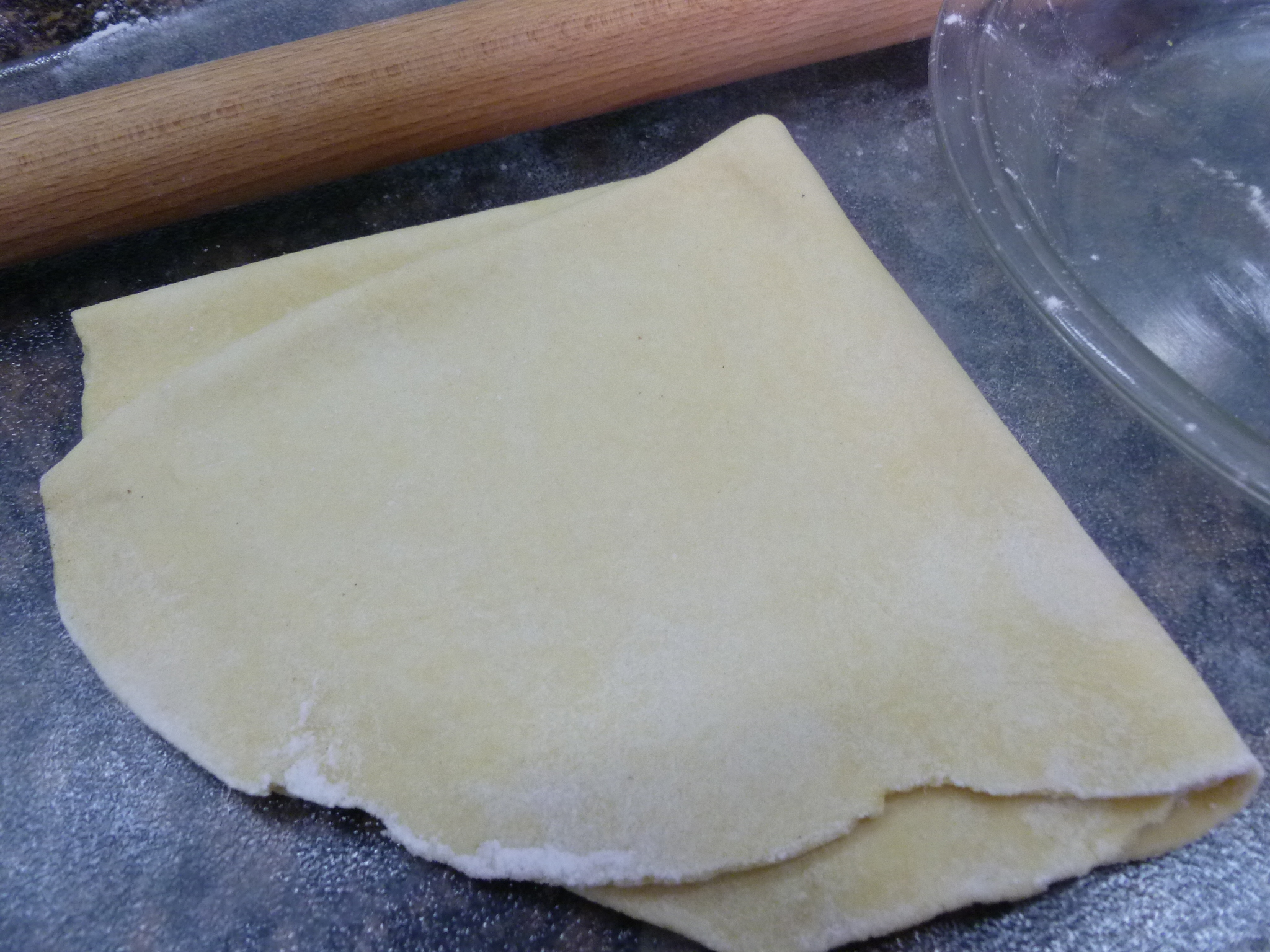 5. Roll out the larger piece into a circle that will fit into the pie pan with an overhang of pastry, fold it in quarters and place it in the pan with the tip of the folded dough centered in the middle of the pan: