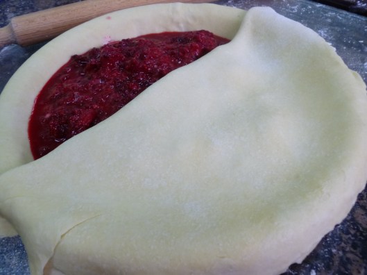6. Unfold the dough in the pan. Roll out the smaller piece into a circle that will fit over the filling, also with an overhang. Pour the filling into the pie shell. Fold the dough for the top crust in half, lift it up and place it over half of the pie: