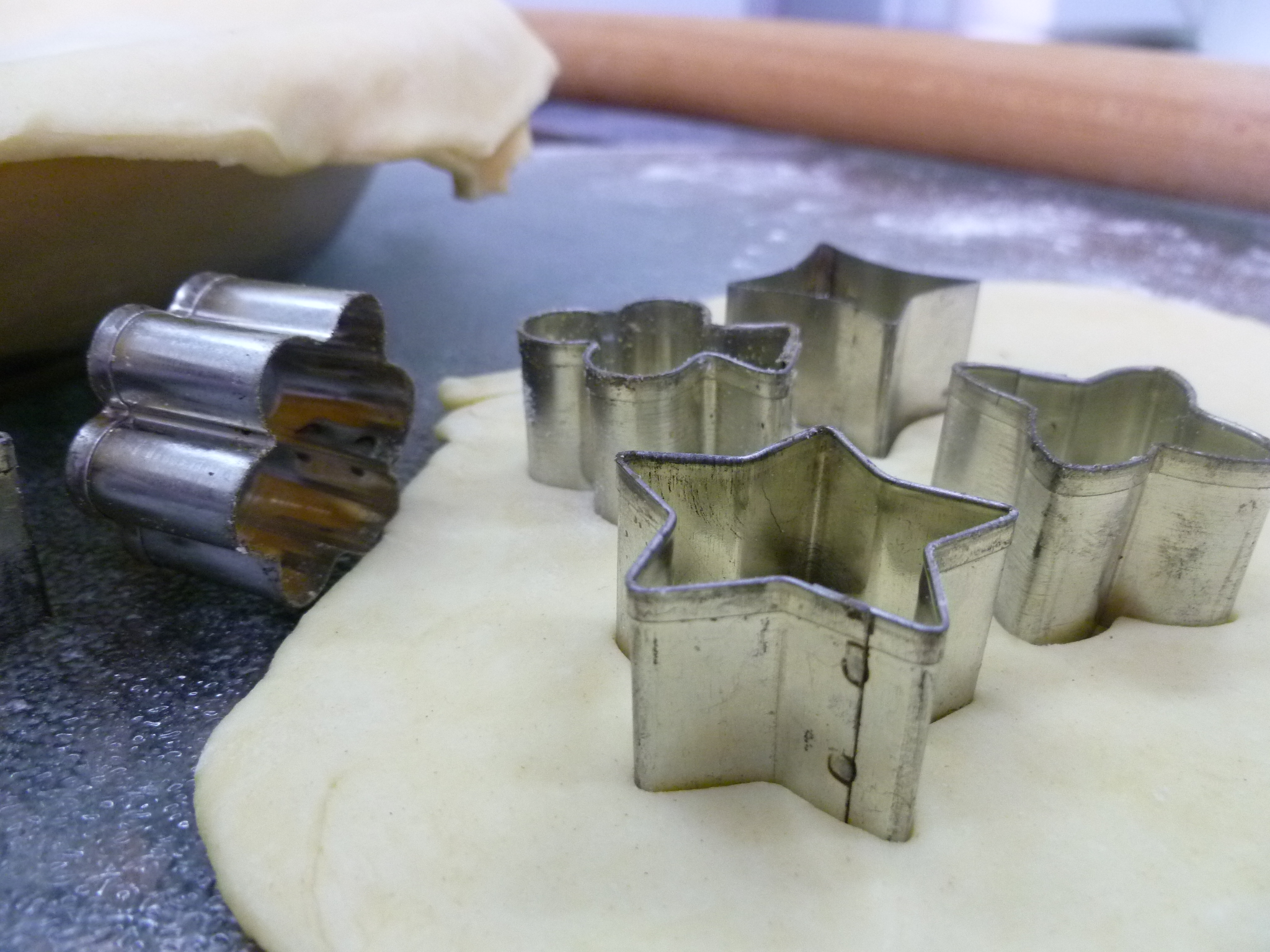 8. Seal and crimp the edges of the pastry together and tuck them inside the pie pan. Place the cut-outs on the top crust, poke some holes in the crust here and there with a skewer or fork and sprinkle it all over with a mixture of cinnamon and sugar: