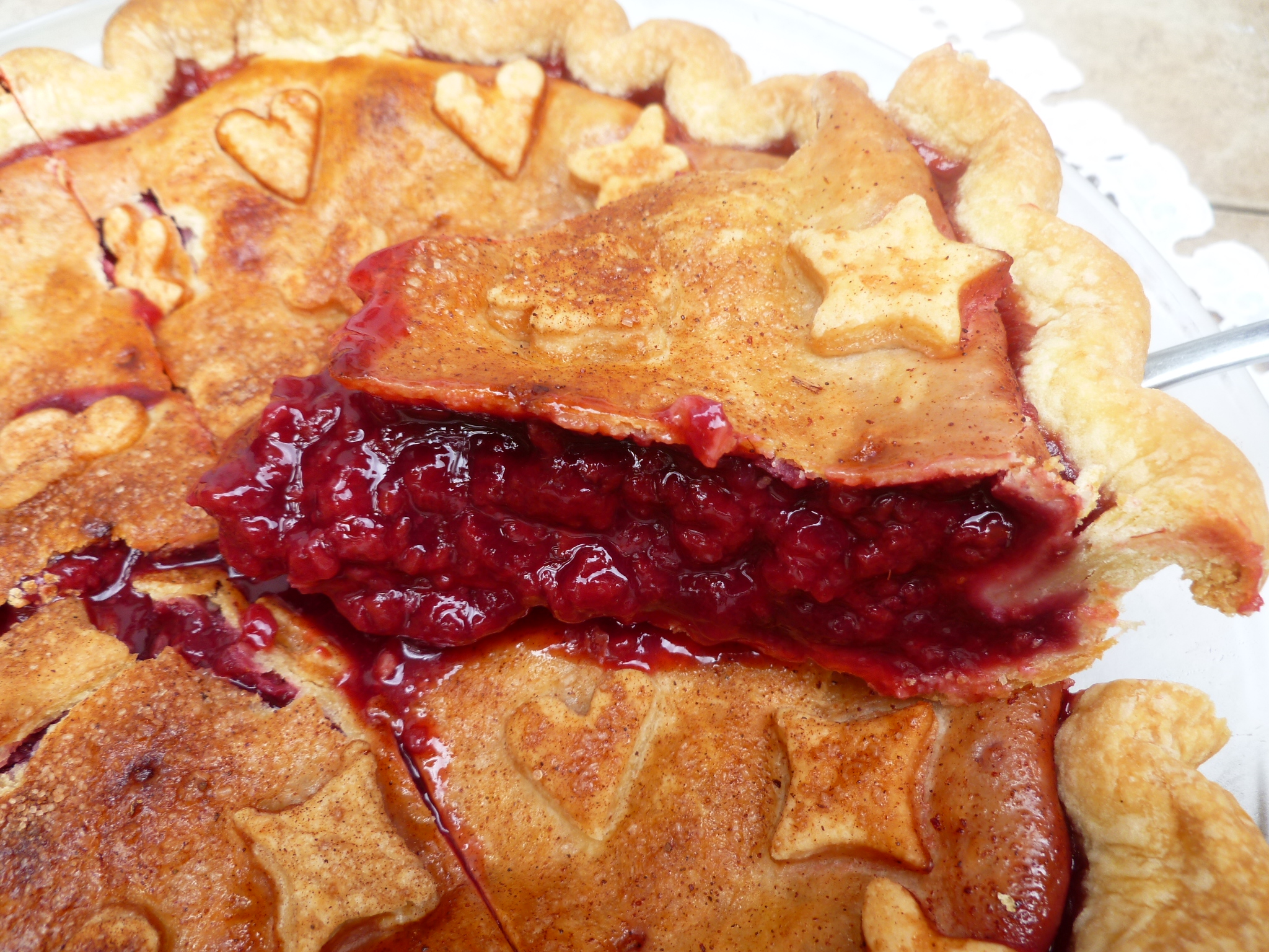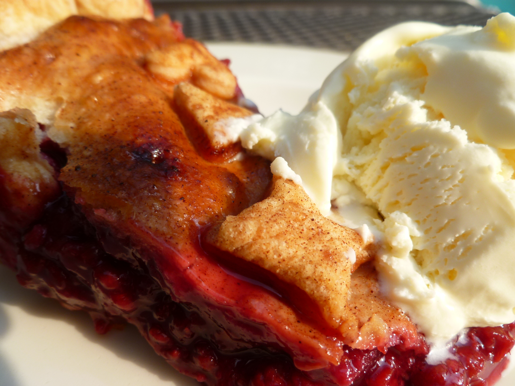 Raspberry Pie is the end of a search begun 10 years ago in Maine. Every day, a small bakery located behind a filling station near the lake where we vacationed placed a handwritten sign out by the road announcing the day’s pies. Several times a week one of them was Raspberry Pie and several times a week we would bring one back to our cabin and eat it sitting on the front porch in the late afternoon. The trail to recreating that pie ends here with one adapted from a recipe on Nicole Weston’s blog, Baking Bites. Her explanation of how to adjust baking times for pies using frozen fruit is especially useful and and she also describes a Vanilla Pie Crust recipe (reproduced here) that is easy, good and different.