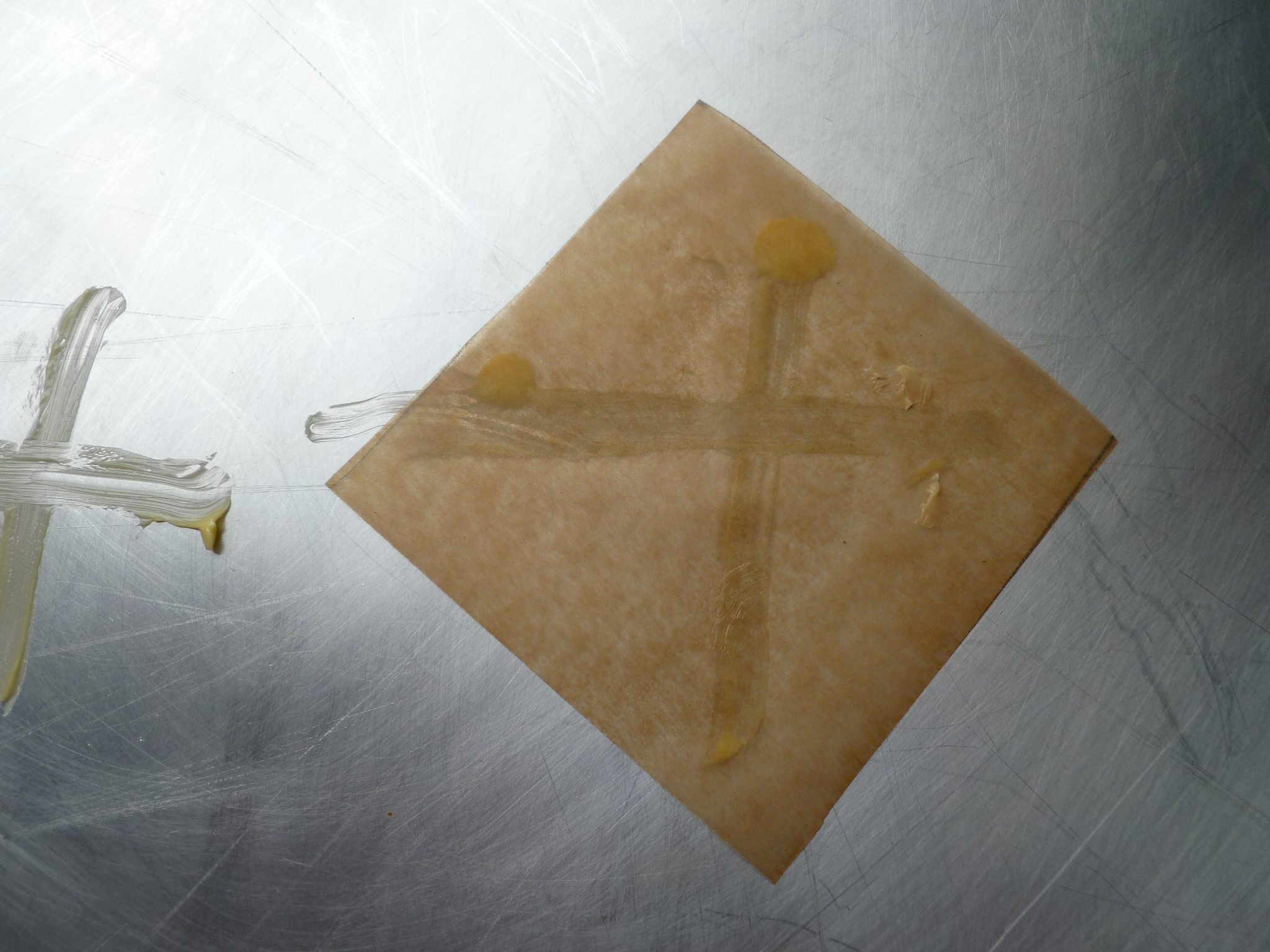 1. Preheat the oven to 375 F. Cut out 8 4-inch squares of parchment paper. Streak the baking sheet with butter to hold down the paper squares and place the squares on the sheet: