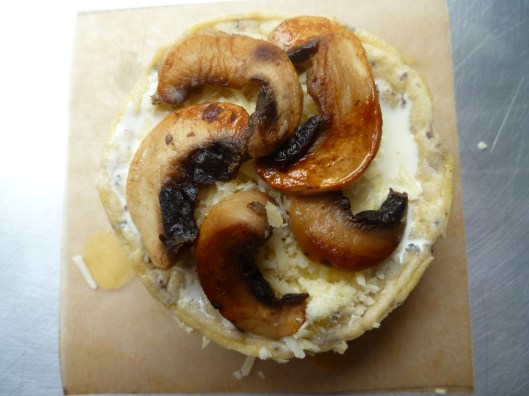 2. Unmold the souffles, peel off the paper rounds, and place the souffles right-side up on the paper squares. Over each souffle pour a teaspoon of heavy cream or creme fraiche, sprinkle on some grated cheese and arrange mushroom slices on top: