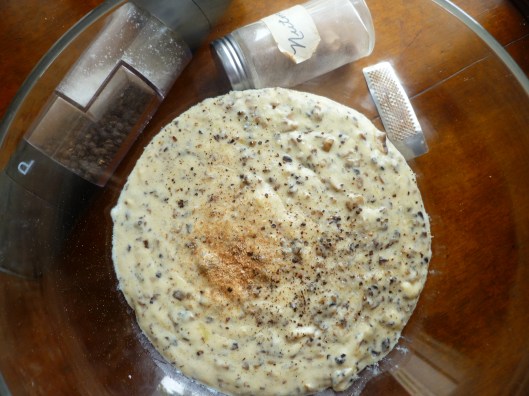 2. Heat a little butter in the frying pan and fry the sliced mushrooms that will go on top of the souffles until they are golden. Cool, cover and refrigerate them to use for the second baking of the souffles. In the same pan, heat the 4 Tablespoons of butter and cook the chopped mushrooms for several minutes until they brown a little. Add the flour and cook it for a minute, stirring. Add the milk and continue to stir until a sauce forms and thickens. Add the 3 ounces of grated cheese, reserving some extra for the second baking. Add some grinds of salt, pepper and nutmeg and cool the mixture: