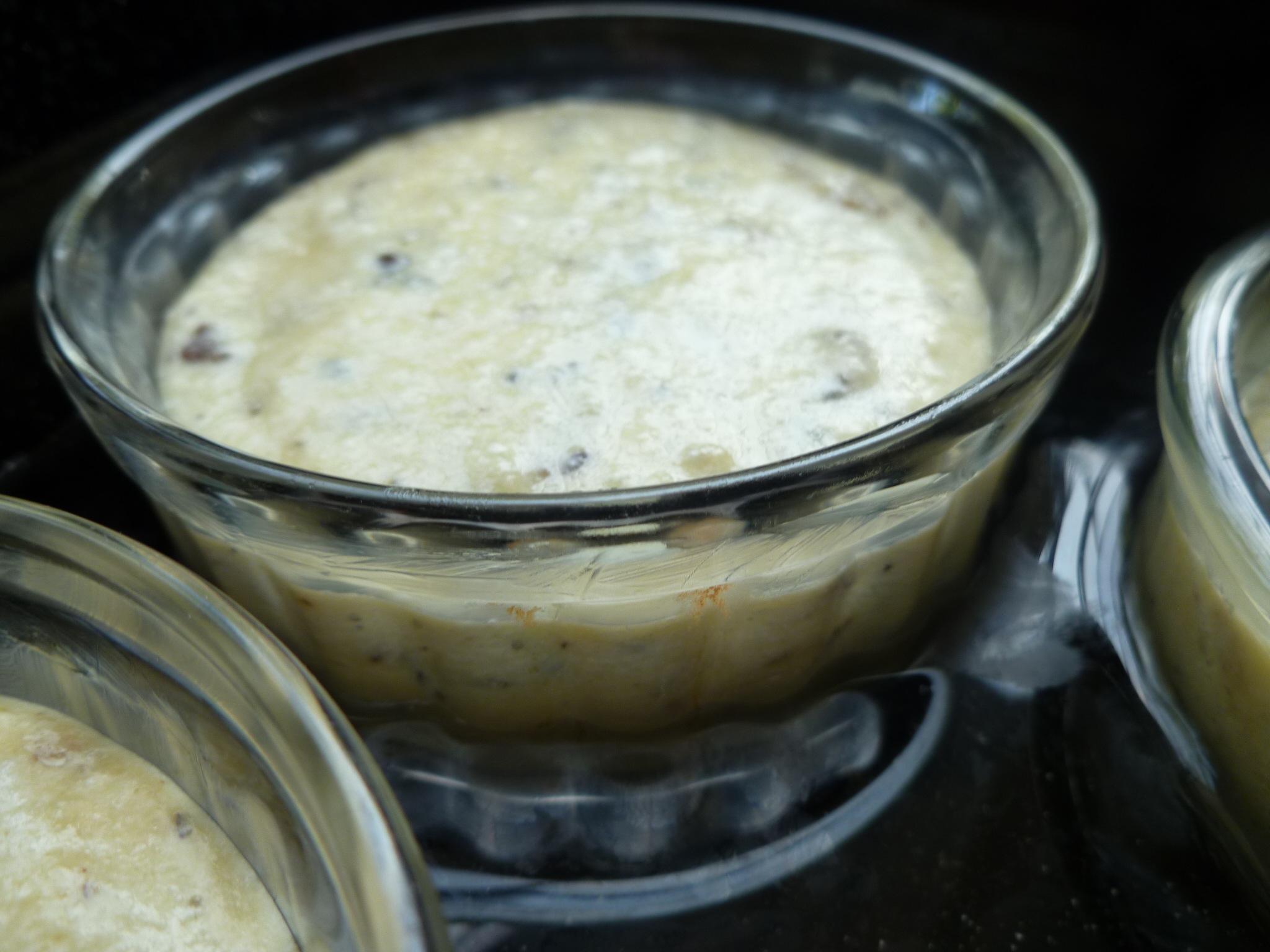 5. Divide the mushroom mixture among the 8 ramekins and place them in a roasting pan. Fill the pan with cold water to reach half way up the sides of the ramekins: