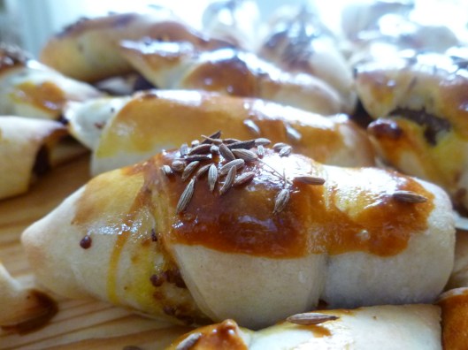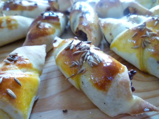 2. Preheat the oven to 400 F. Brush the rolls with beaten egg yolk and sprinkle them with cumin seeds. Bake them for about 15 -20 minutes–as long as it takes the tops to turn a golden color.