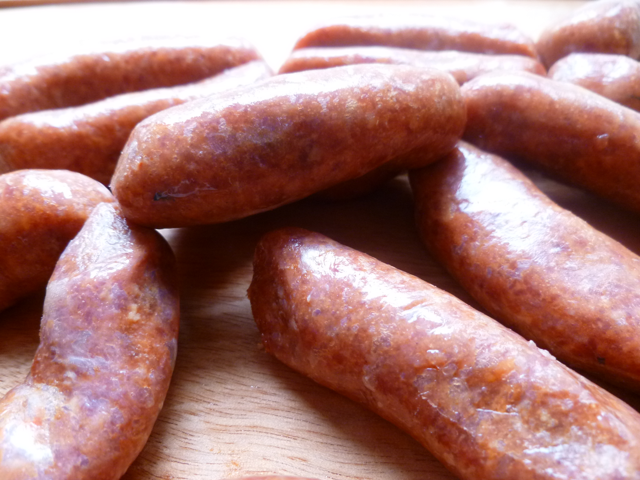 Petits ‘Cochons’ is really a misnomer. The merguez sausages used to make them are made of lamb, and sometimes, also, beef. Some versions of merguez are spicier than others, but there is no correlation between their burn and their appearance. Sumac, a spice common to Middle Eastern and some Mediterranean cuisines, gives them their nice, deep reddish color.