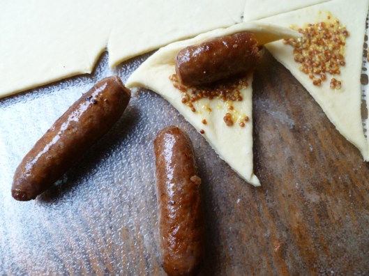 3. Brush a strip of triangles with Dijon mustard. To make a roll: place a piece of sausage at the base of the triangle and roll it up in the dough toward the narrow tip of the triangle: