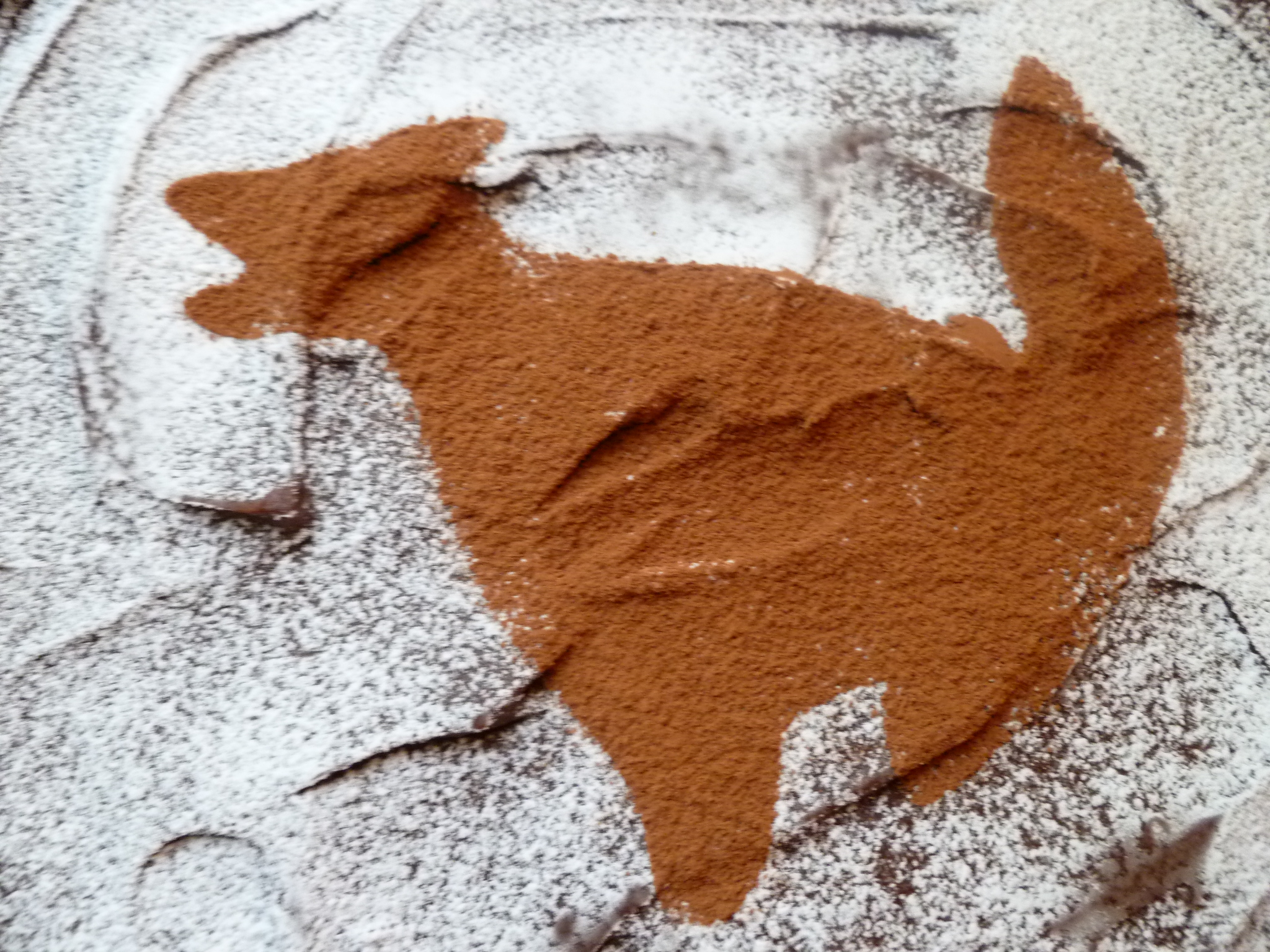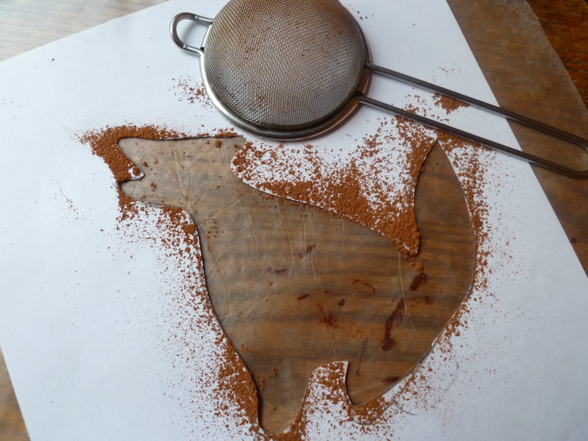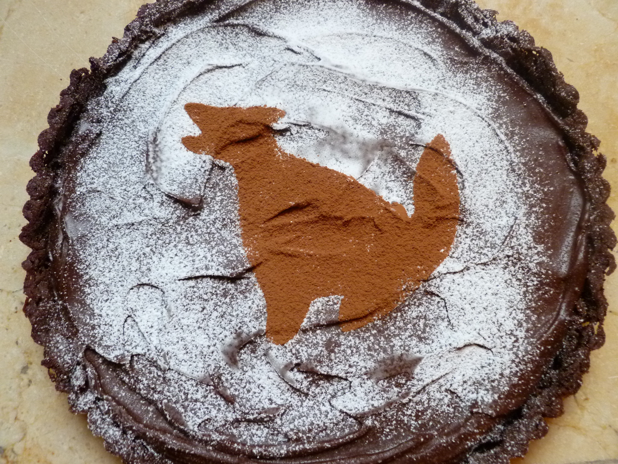 8.  Decorate the tart when it is cold.  (If the tart is decorated several hours in advance, it should be kept in a cool, dry place so that the powdered sugar doesn’t become damp.  Alternatively, decorating the tart right before serving it will take only a few minutes.)  First, draw or trace a simple design on a plain sheet of white paper and cut it out.  The tarts in the photos were decorated using a coyote drawing…