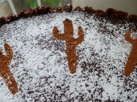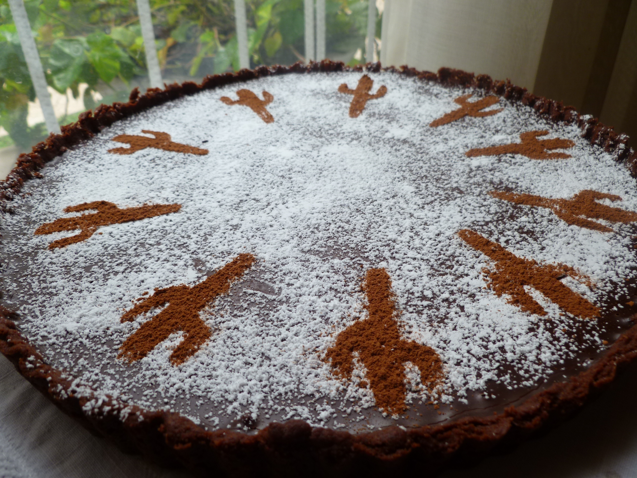 9.  Unmould the tart by pressing up on the bottom of the pan and loosening the crust from the sides of the ring.  Remove the ring and place the tart, still sitting on the circular bottom of the pan, on a flat serving tray or wherever you intend to cut it.  Put some powdered sugar in a small strainer and sift it all over the tart.  Then place the stencil over the tart, replace the sugar in the strainer with cocoa, and sift it over the cut-out spaces in the stencil to make, for example, cactuses: