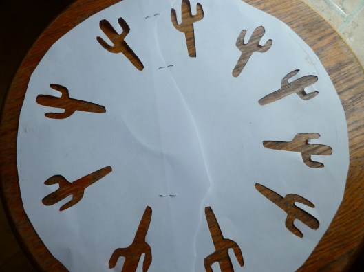 …and a homemade cactus stencil, stapling two sheets of paper together to make a form large enough to fit the surface of the tart: