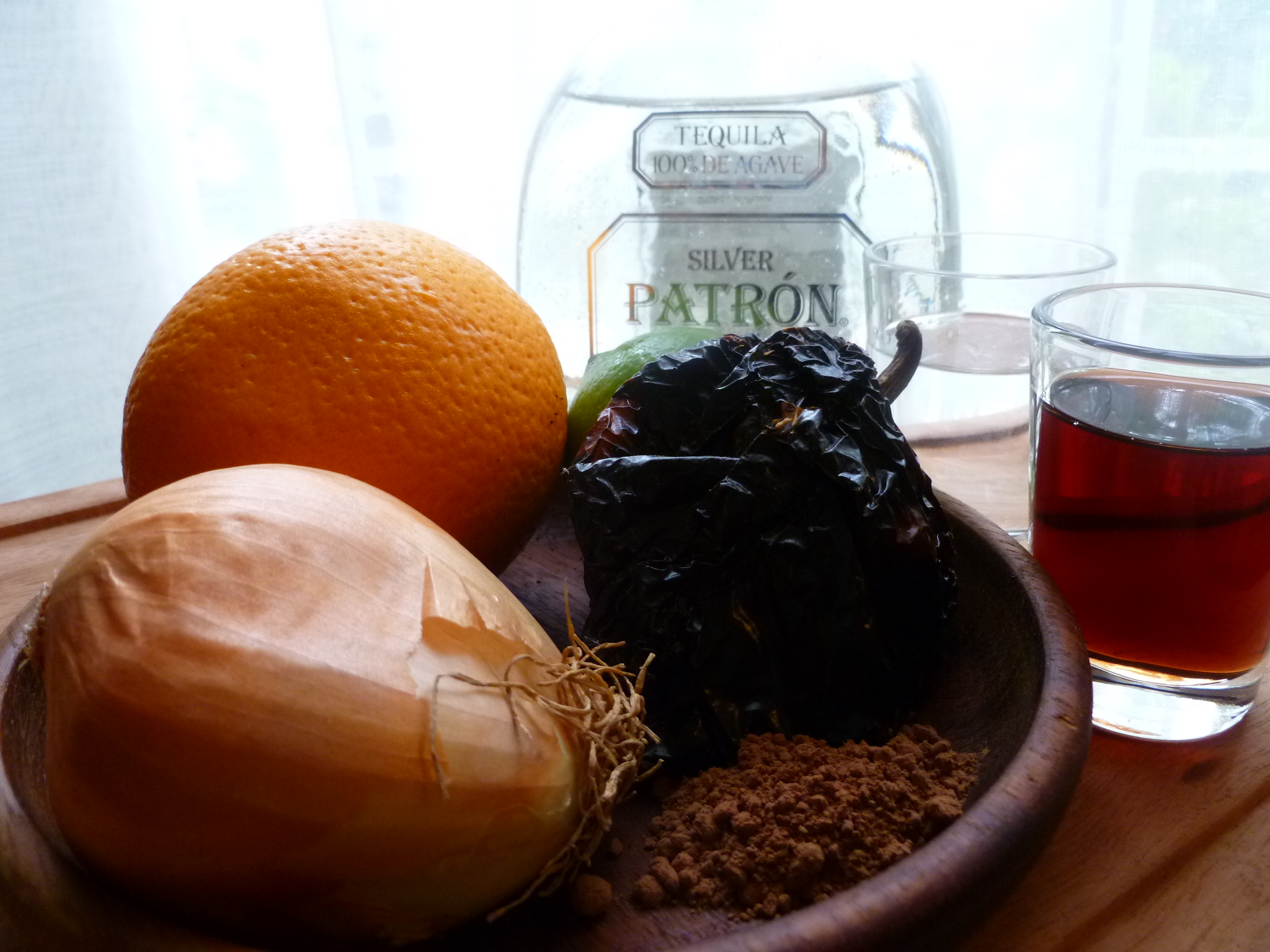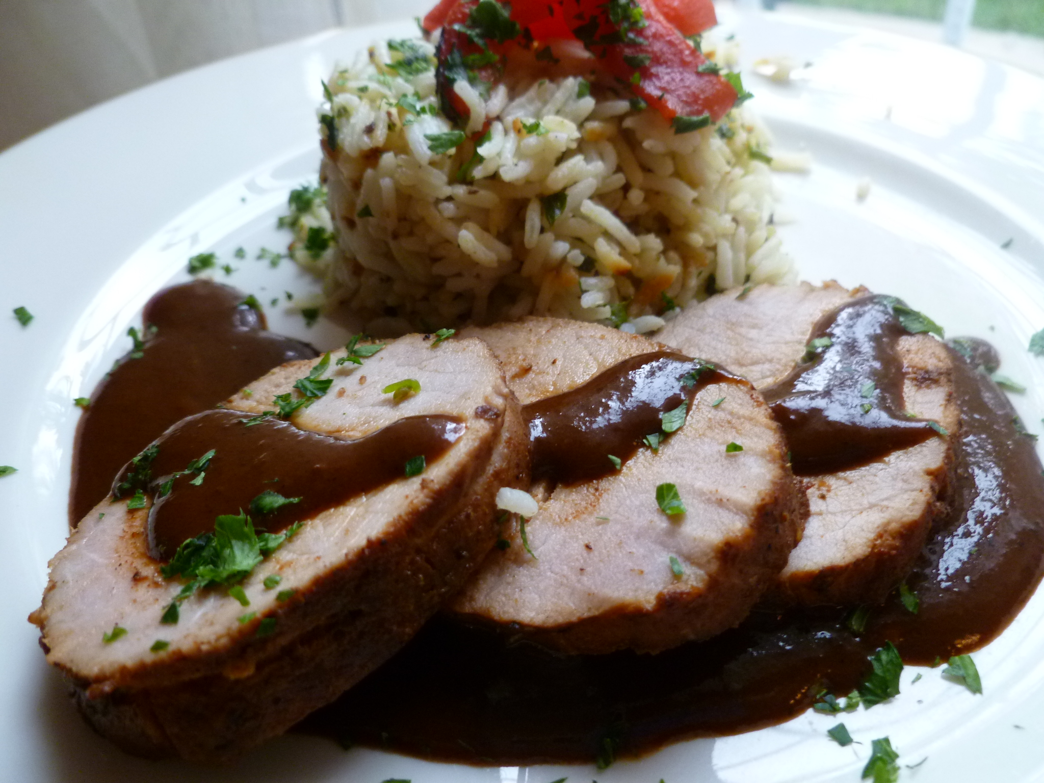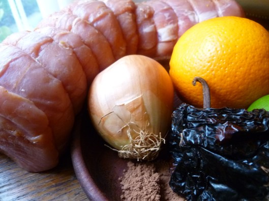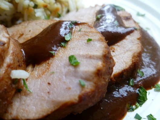 ancho chili, Chocolate, demi-glace, grenadine, James Peyton, meat and fruit recipes, Mexican meat recipes, Pasilla chilis, pork loin roast, pork with oranges
