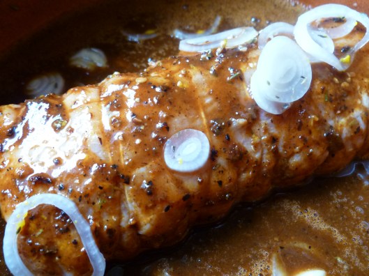 3. Put the marinade in the Dutch oven or casserole, mix in the sliced onion and add the pork loin. The roast may be marinaded in the refrigerator for up to two days and long marinading will tenderize the pork: