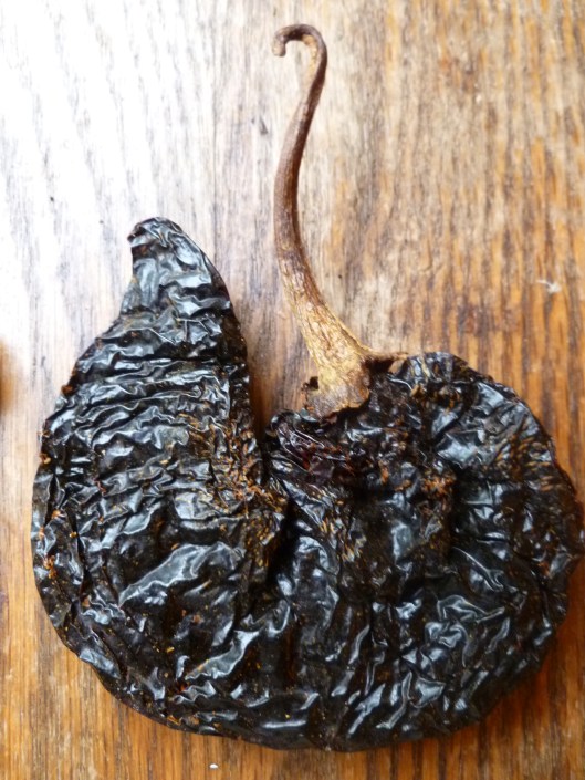 ‘Pasilla’ means ‘little raisin’ and the chili’s black, wrinkly skin accounts for the name. Even though the chili in the photo isn’t a true Pasilla, its appearance suits the description, too. A true Pasilla is the dried form of the long, narrow Chilaca pepper. But in the United States, fat Ancho chilis (which are the dried form of Poblano peppers) are also called Pasillas. For the photographed roast, ‘so-called Pasilla chilis’ were used and they do very well if you can’t obtain the real Pasilla.