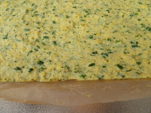 5. When you are ready to make the croquettes, lift the mixture out of the pan by the edges of the paper and place the mixture, paper and all, on the pastry board: