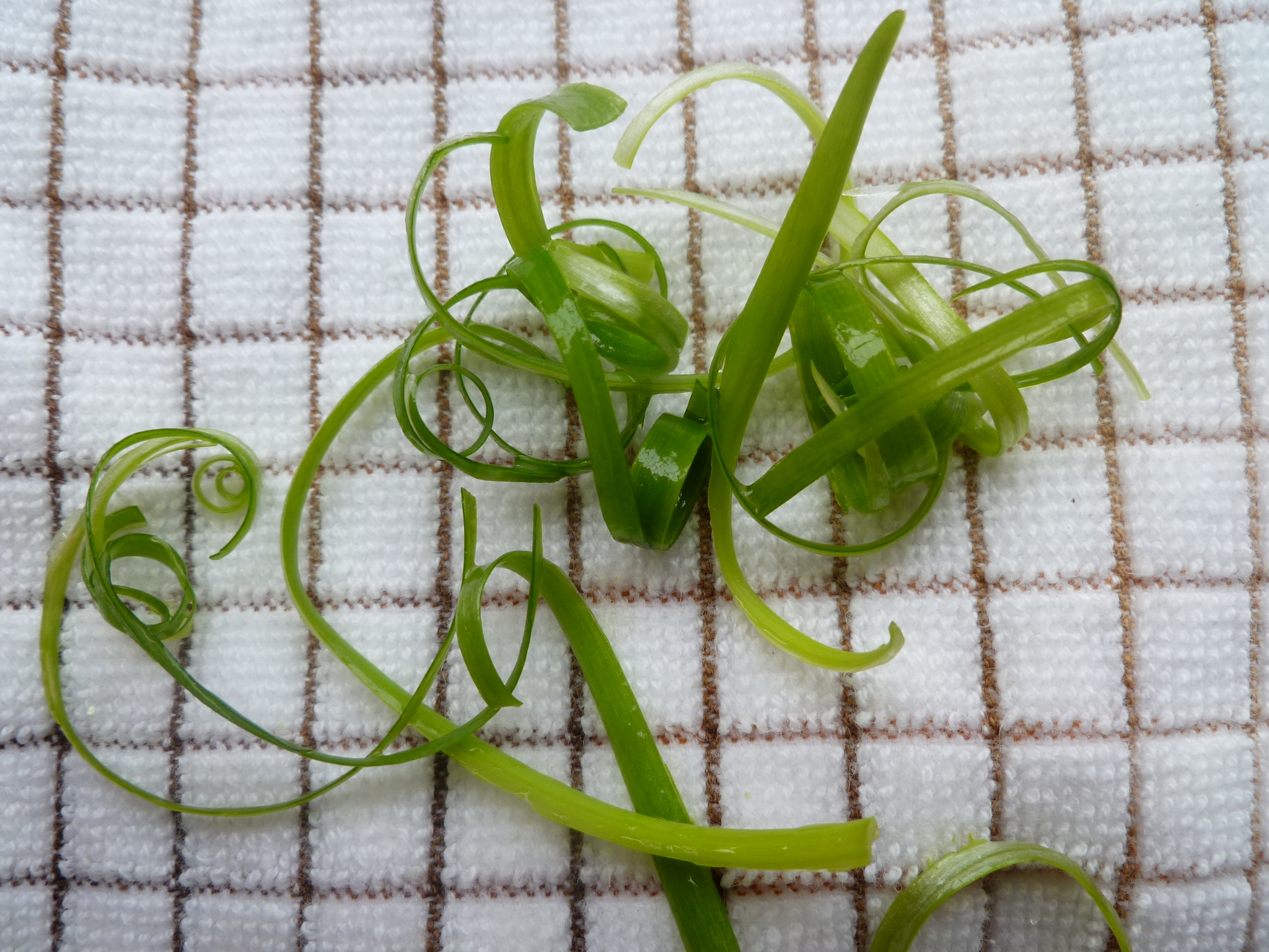1. Cut the green parts of a couple of the onions lengthwise into thin strips: