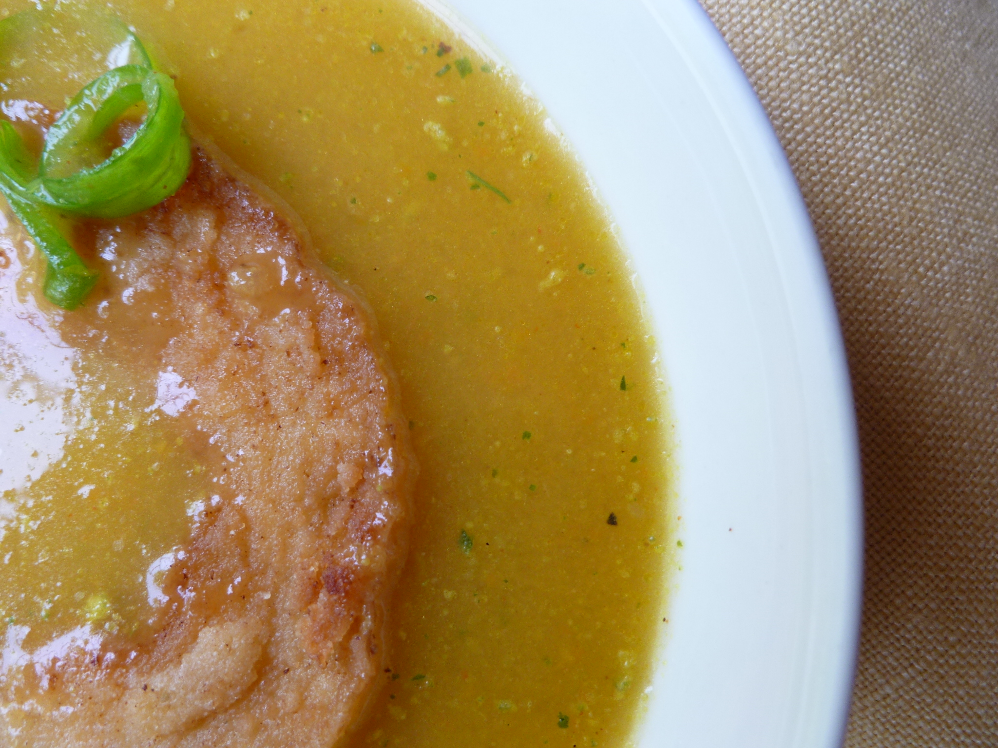 2. Heat the sunflower oil in a flat-bottomed pan. Lightly dust the apple rings with rice flour, brown them, drain them, and set them aside to place in the bowls of soup just before serving.