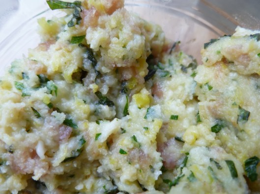 3.  Add the Prosciutto, parsley, basil, breadcrumbs and Parmesan to the bowl of zucchini flesh, and then, the beaten eggs.  Grate some nutmeg into the mixture, grind some black pepper and salt over it, and set the mixture aside.
