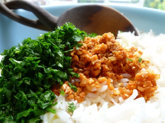 4. Add the browned garlic, butter and parsley to the bowl of rice: