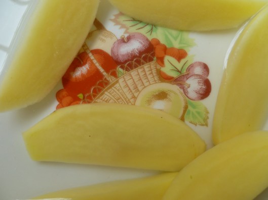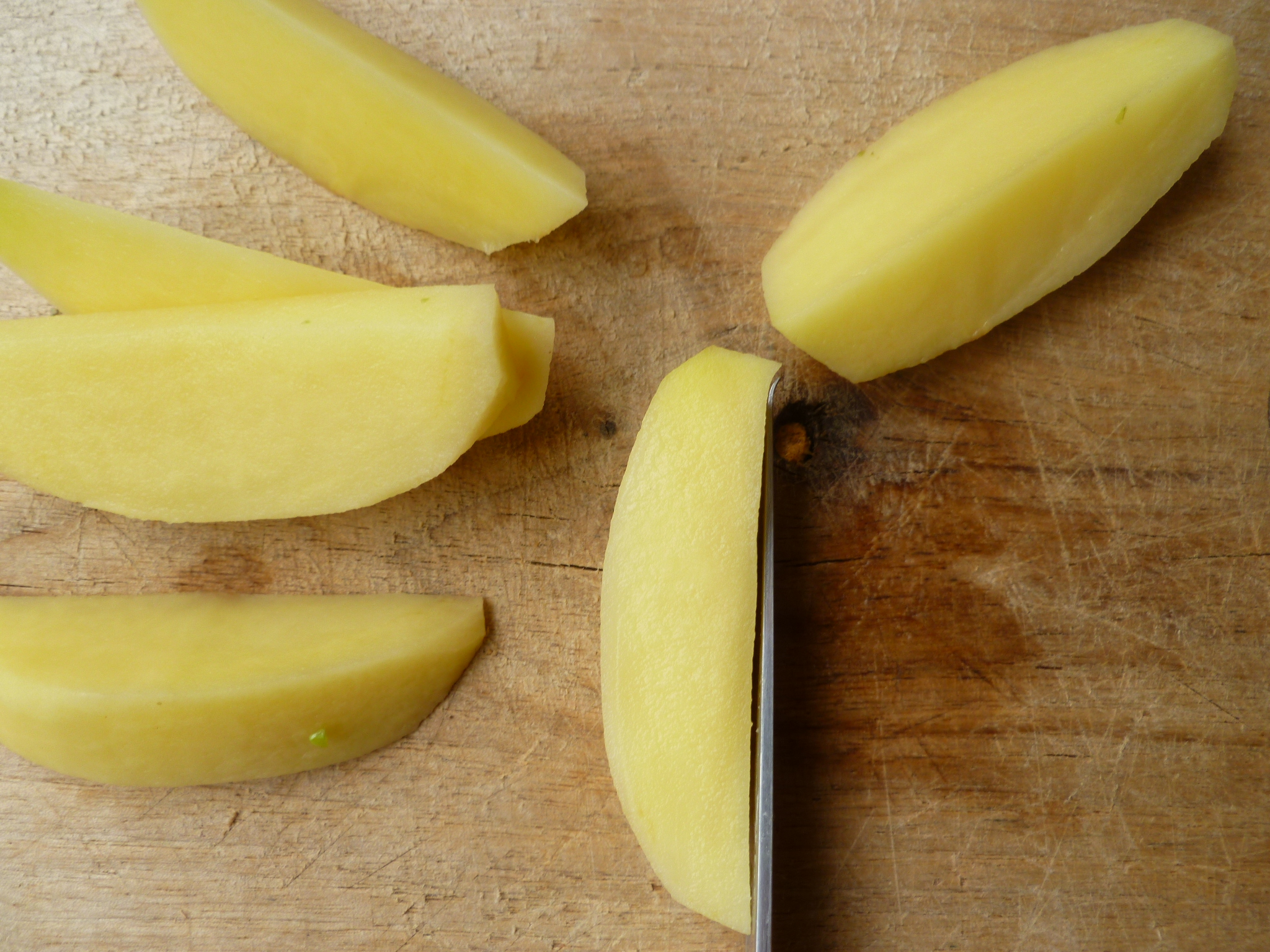 2. Put the wedges in a pot and fill it with water to cover them. Bring the water to a boil over Medium heat and cook the potatoes until they are just done–for perhaps 10 minutes.