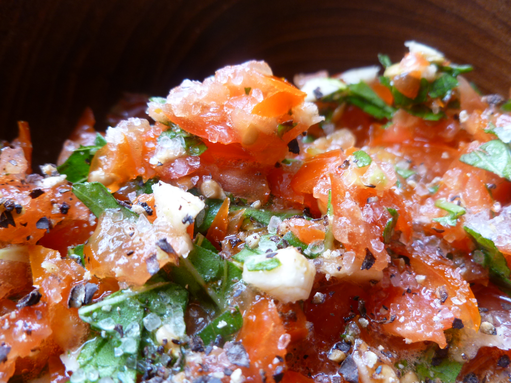 1. Mix together the tomatoes, basil, pine nuts, and garlic and grind some salt and black pepper over everything: