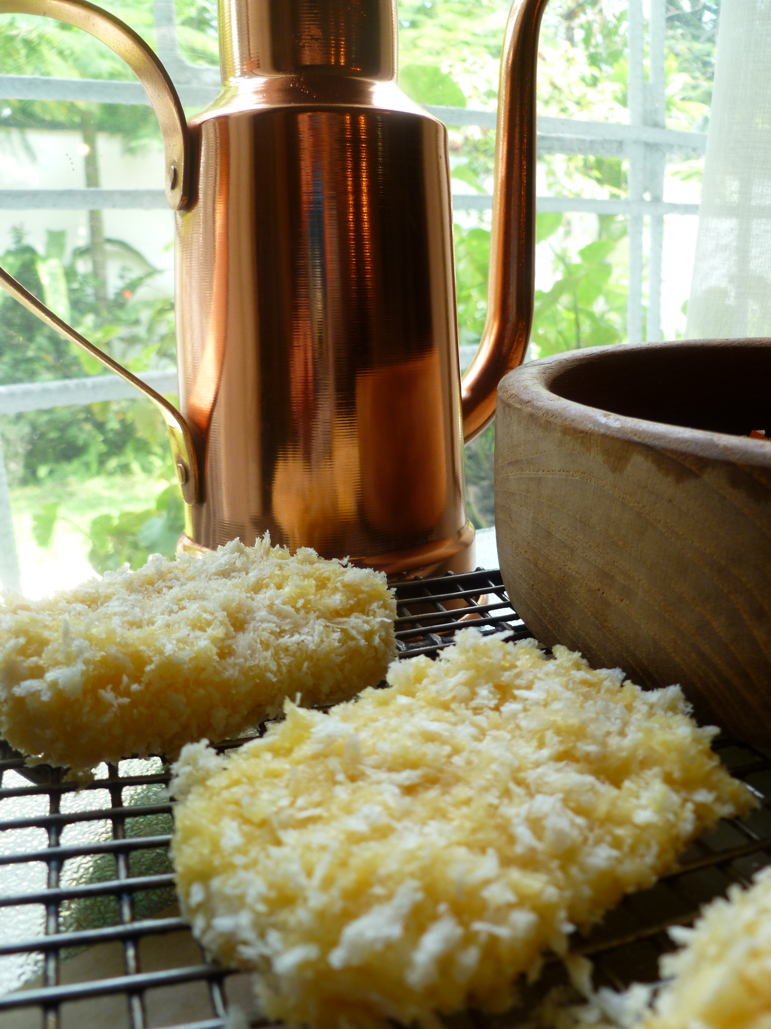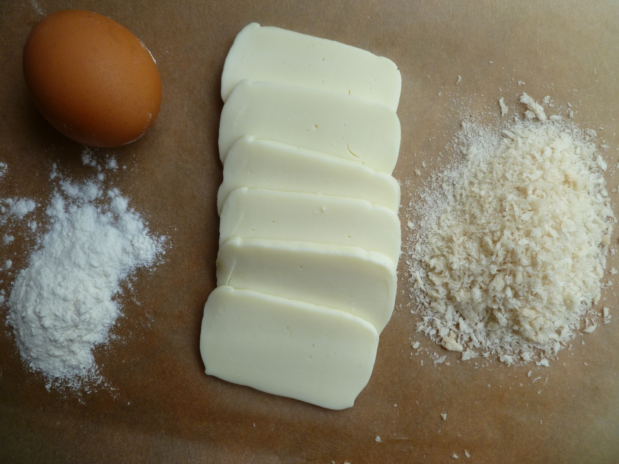 1. Bread the slices by putting them consecutively in : flour, egg, and Panko.