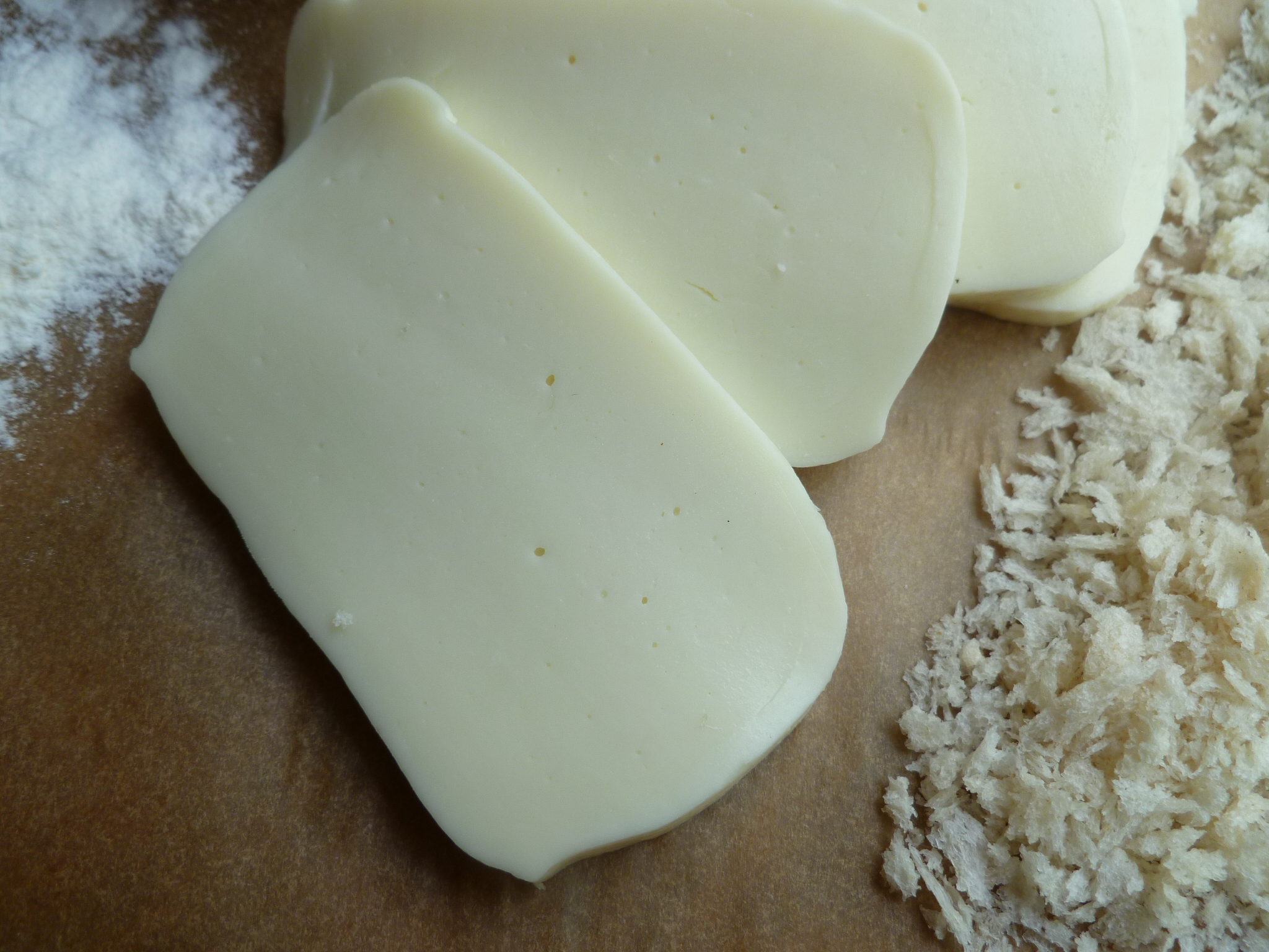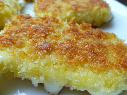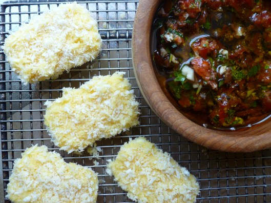 Now, however, fresh Mozarella is available in many lands, including Mrs. David’s England and in the United States. So a person frying it is in little danger of badly cooking it, if the Mozarella she starts with is of the fresh sort, and not the rubbery substance that may call itself ‘Mozarella’ but, cannot turn itself into anything edible that is good. Fresh Mozarella may be found afloat in little brine-filled plastic sacks or vacumn sealed–and either way, it will be a bit soft to the touch and moist.