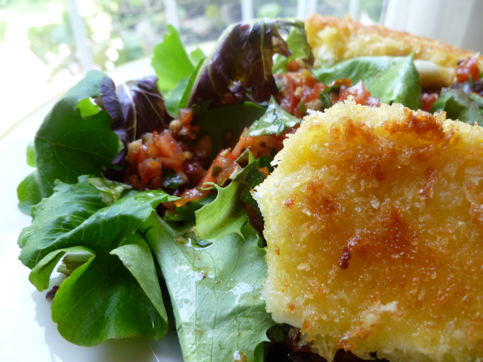 4. If the salad is for a Salad Course, you may want to skip the Fried Mozarella. In this case, divide the lettuces among plates and spoon the tomato mixture and vinaigrette over them just before serving…