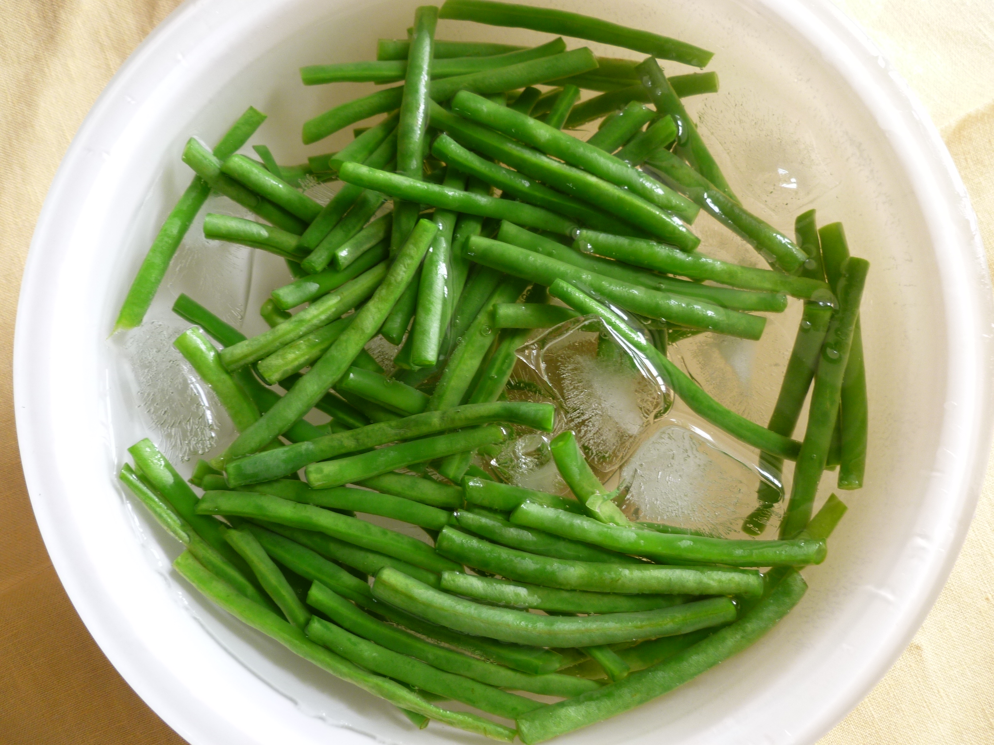 3. Put the beans in the boiling water and cook them for 2 minutes. Drain them and put them in a bowl of ice water until you are ready to heat and serve them: