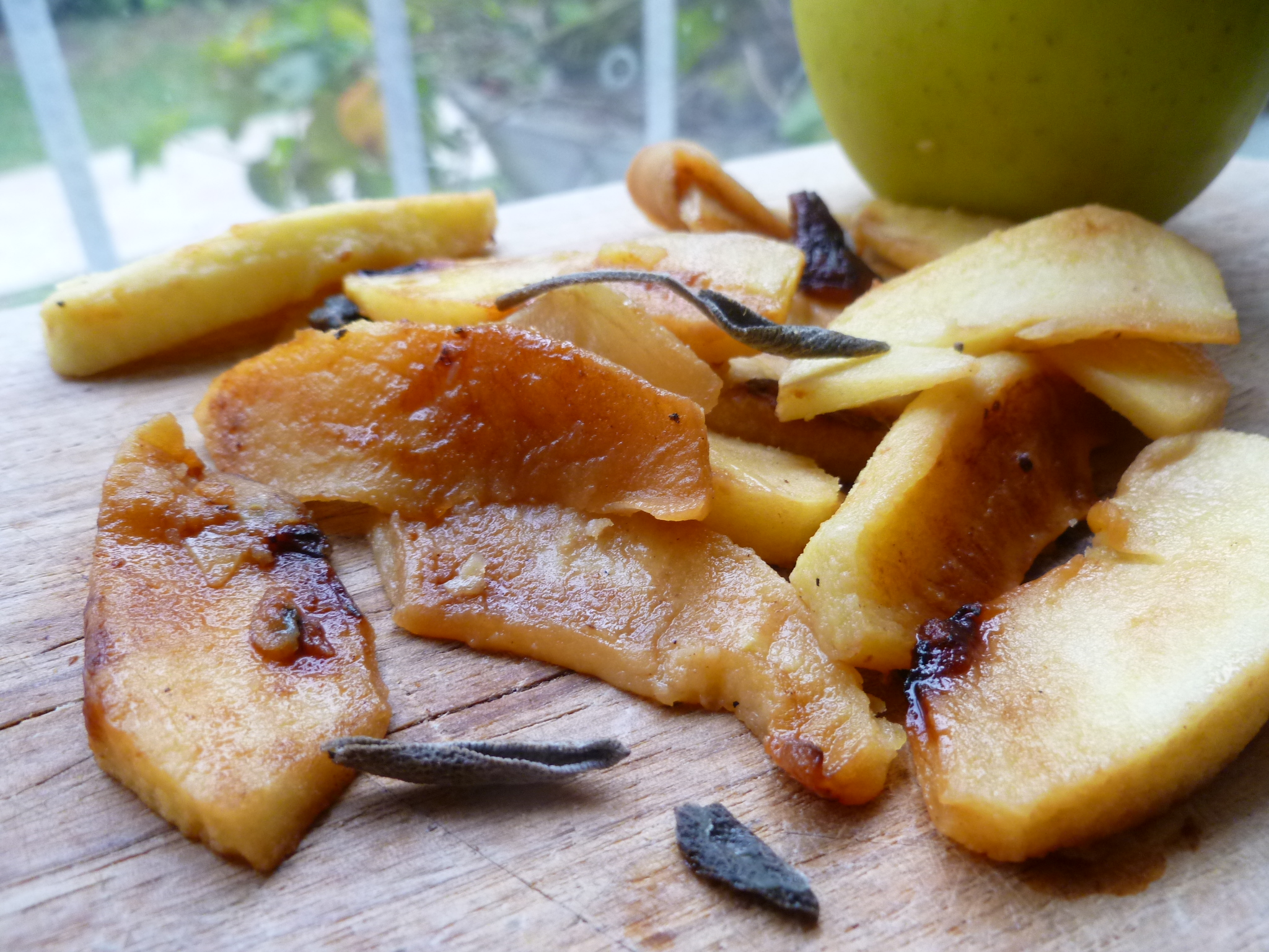 1. Heat the butter in a heavy-bottomed frying pan and add the apples and water and sage.