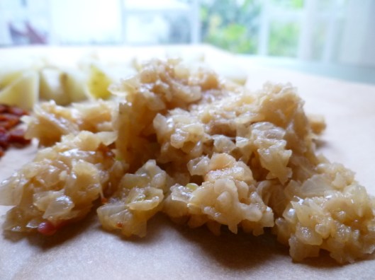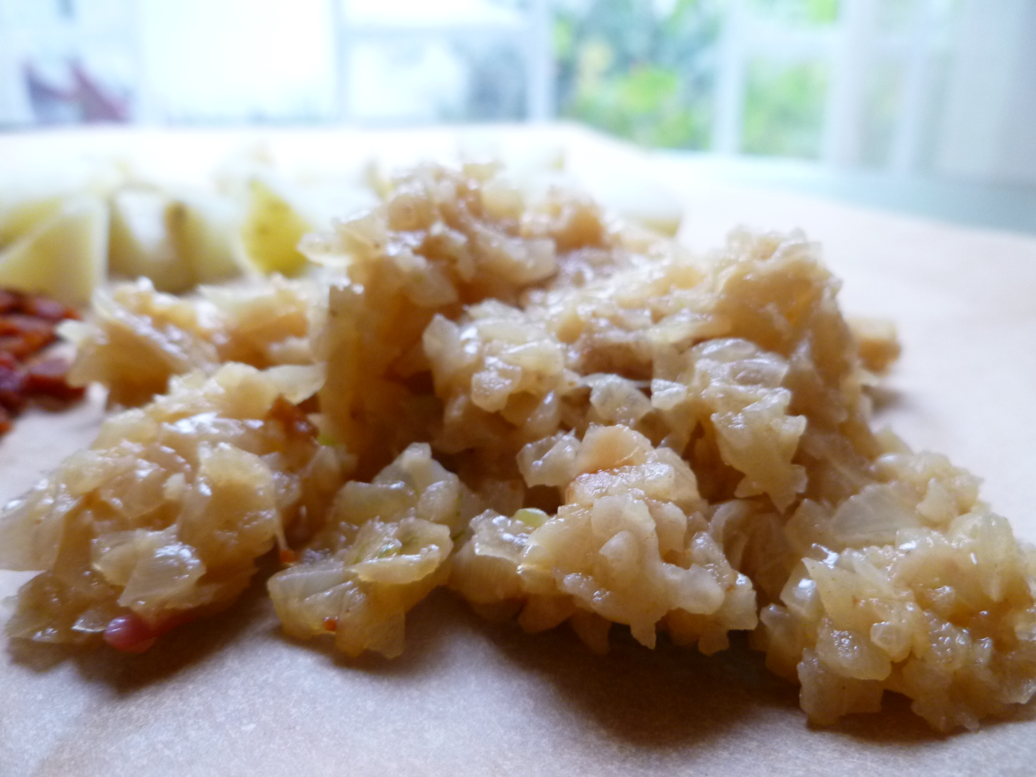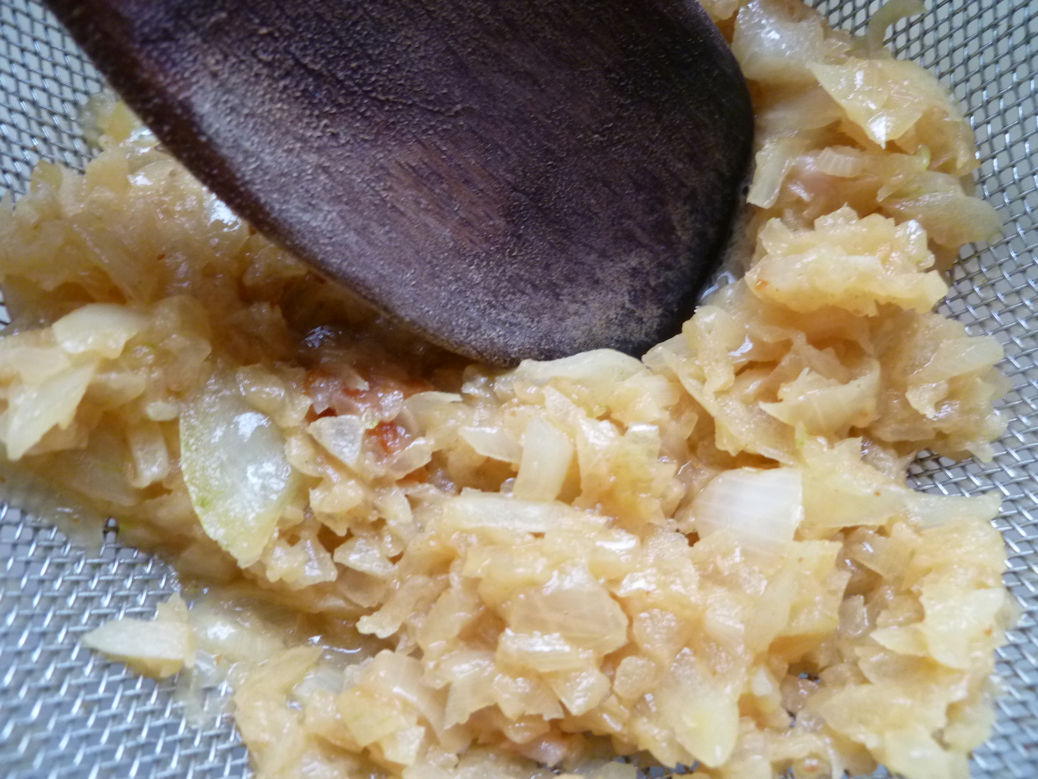 6. Add the chopped onion to the rendered bacon fat and butter and fry the onion until it begins to turn a shade of gold. Remove the chopped onion from the pan to a strainer and press on it with a spoon to remove as much of the fat as possible…