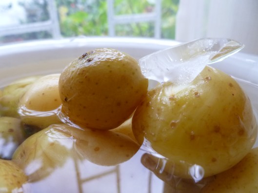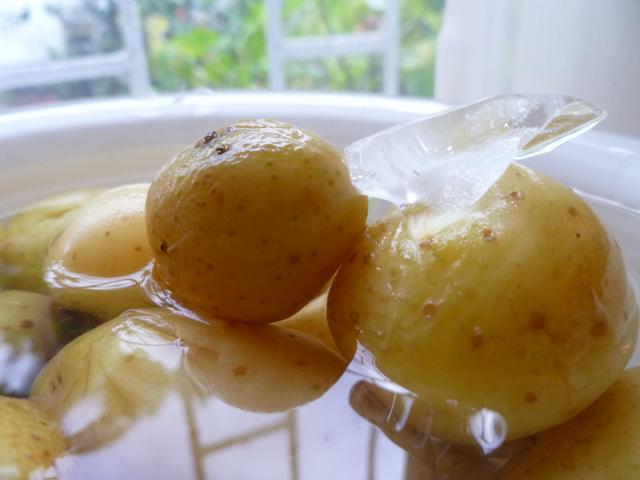 2. Put the potatoes in the pot, fill it with water, and boil the potatoes just until they are tender. (About 15 minutes for small potatoes and 20 for larger ones is a reasonable estimate. When a potato is done, a skewer will just pierce through it without breaking it.)
