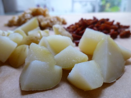 4. Drain them again right away and spread them on a cotton dish towel to dry for a minute or two. Peel them–or not–it makes no difference with thin-skinned potatoes. Cut them into small-ish cubes: