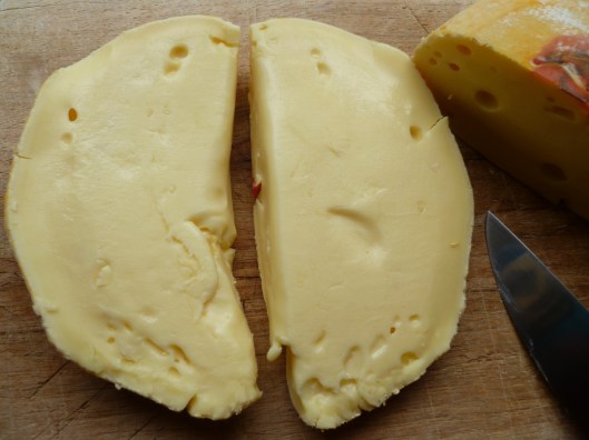 11. Cut the round of cheese down the middle into two halves. (Put away one of the halves for another day.) Cut through the other half horizontally to make two half-circles: