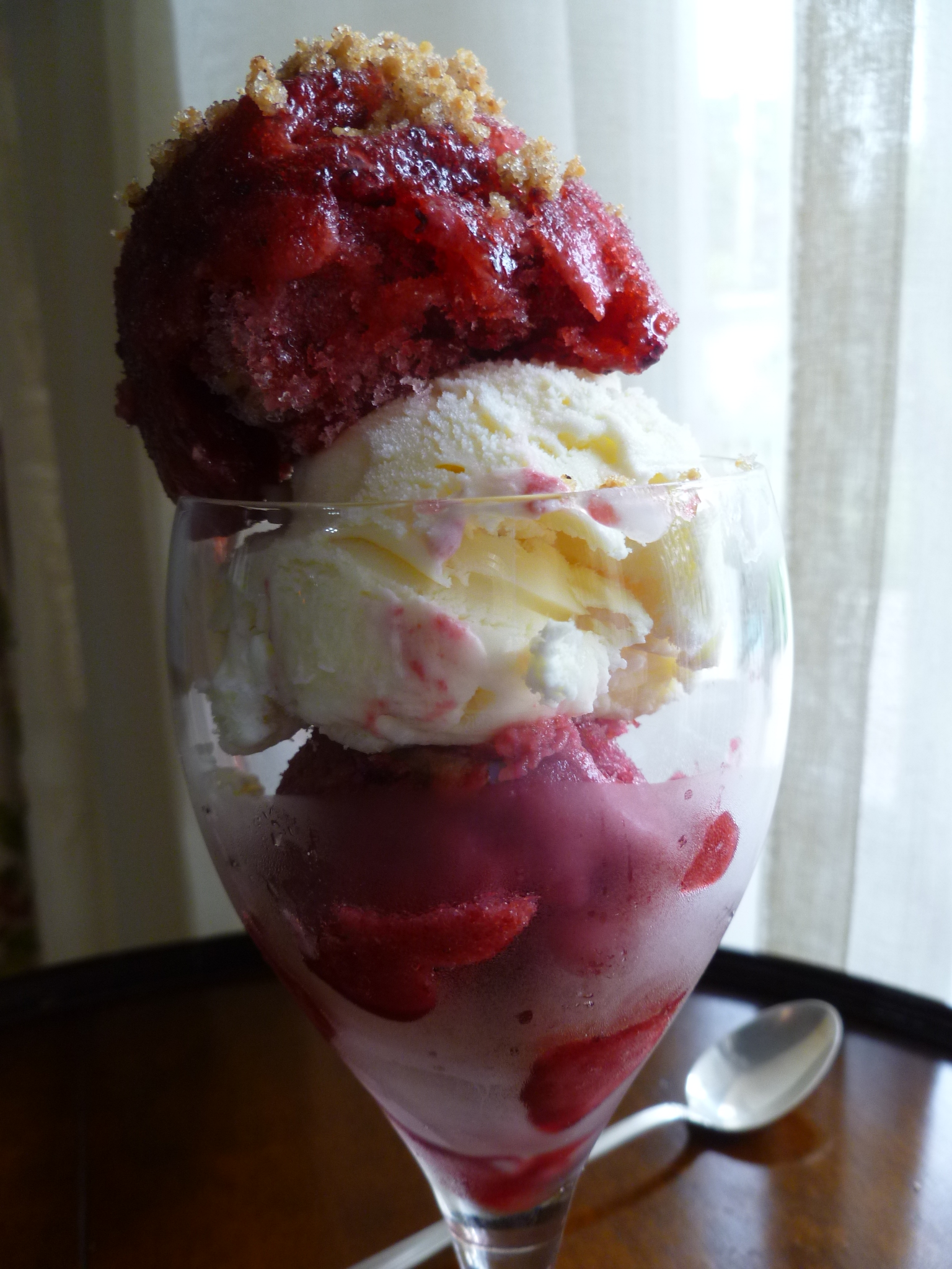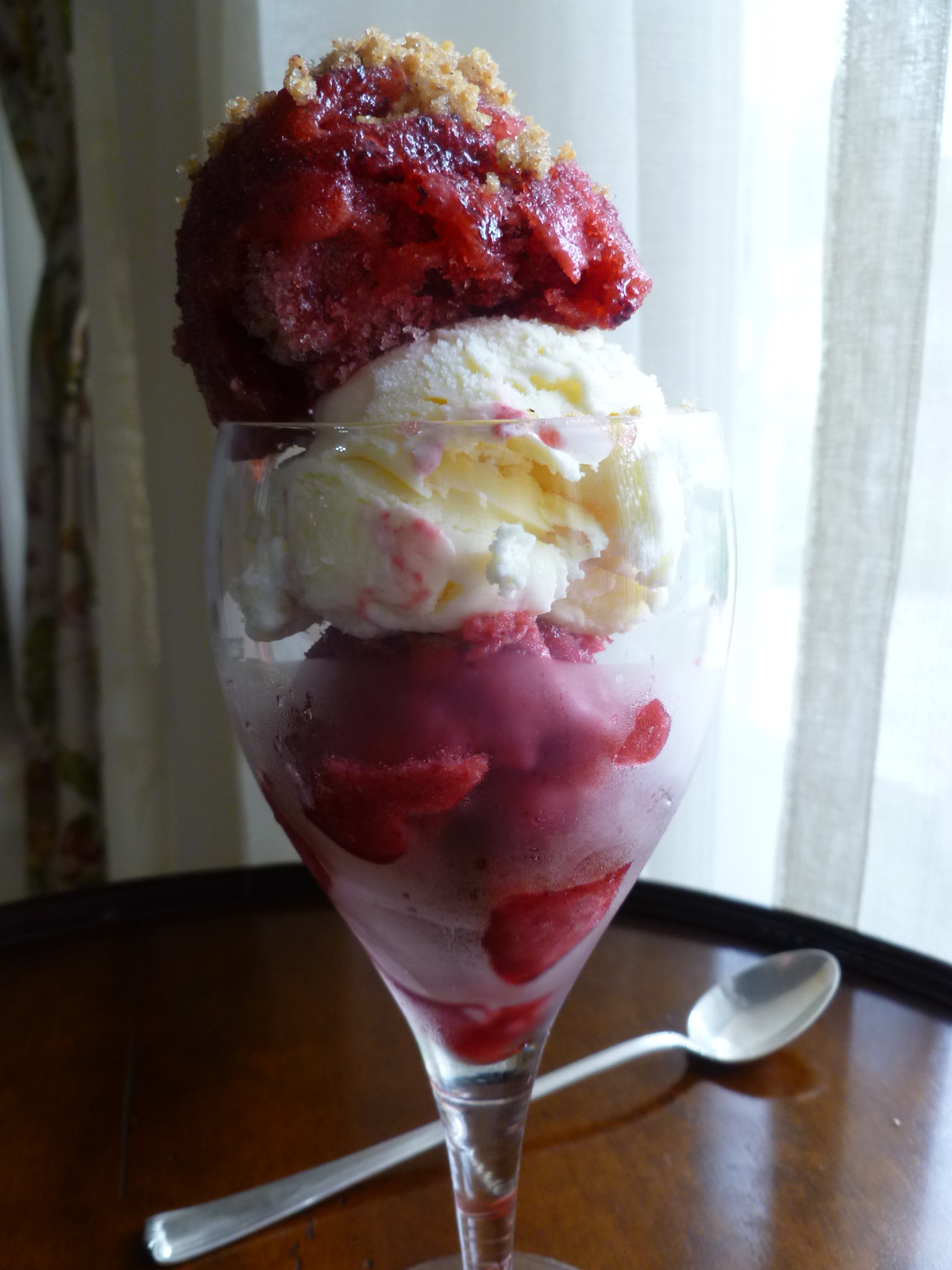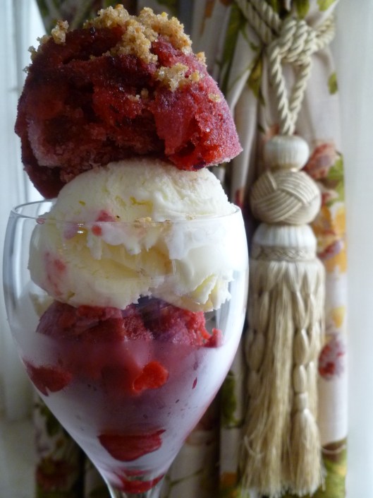 1. To each glass add a scoop of Red Currant Sorbet. Rinse the ice cream scoop and add a scoop of Vanilla Ice Cream to each, and finally, a scoop of Plum Sorbet. It’s good to begin with the Red Currant Sorbet and place the ice cream on top of it. The Red Currant Sorbet has the most distinctive flavour of the three parts of the Parfait and the ice cream, melting and mixing with the sorbet below, mellows it just enough.