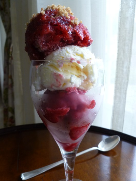 A Note: Parfaits of Homemade Plum and Red Currant Sorbets, Vanilla Ice Cream and Sugared Ground Walnuts is served for Dessert in the Lunch Menu: Lunch on a Winter’s Day.