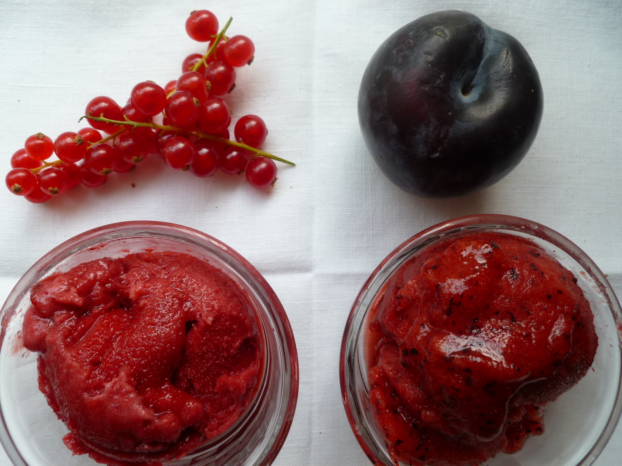 dessert recipes with fruit, ground walnut topping, homemade vanilla ice cream, parfaits, plums, red currants, standard recipe for fruit sorbets