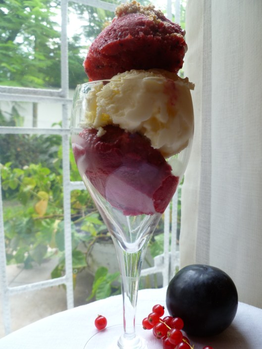 Parfaits of Homemade Plum and Red Currant Sorbets, Vanilla Ice Cream and Sugared Ground Walnut Topping (for 6 people, and easily for more or fewer by changing the quantities of sorbet and ice cream mixture you make)